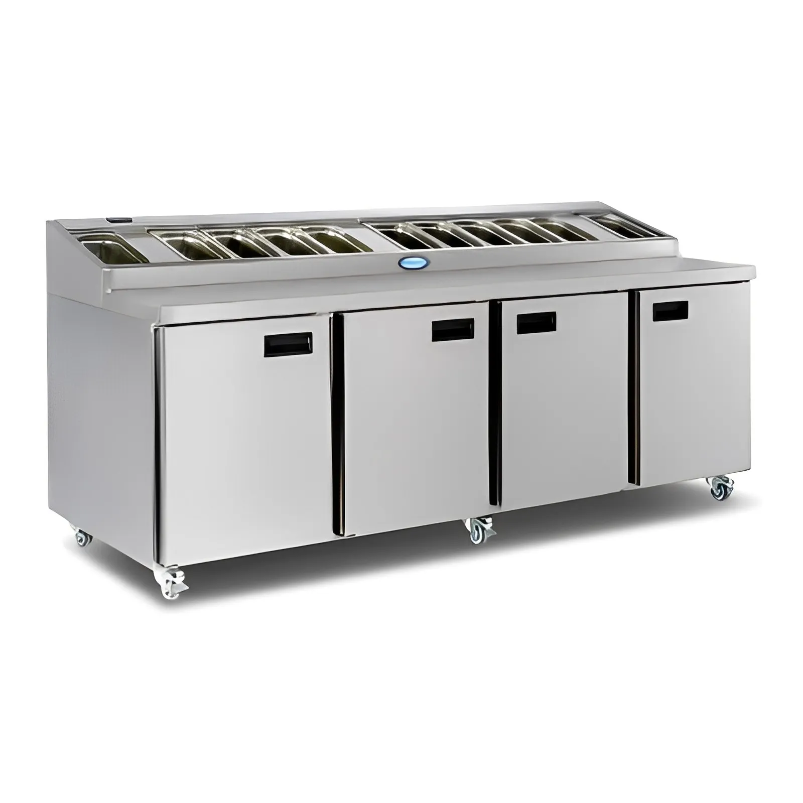 The fan-assisted, forced air system delivers even-temperature storage to both the counter base and top pan storage section, meeting HACCP temperature requirements. The range is presented with a modern, sleek 304 stainless steel exterior and aluminum interior, placing hygiene at the forefront of design for storing open ingredients.