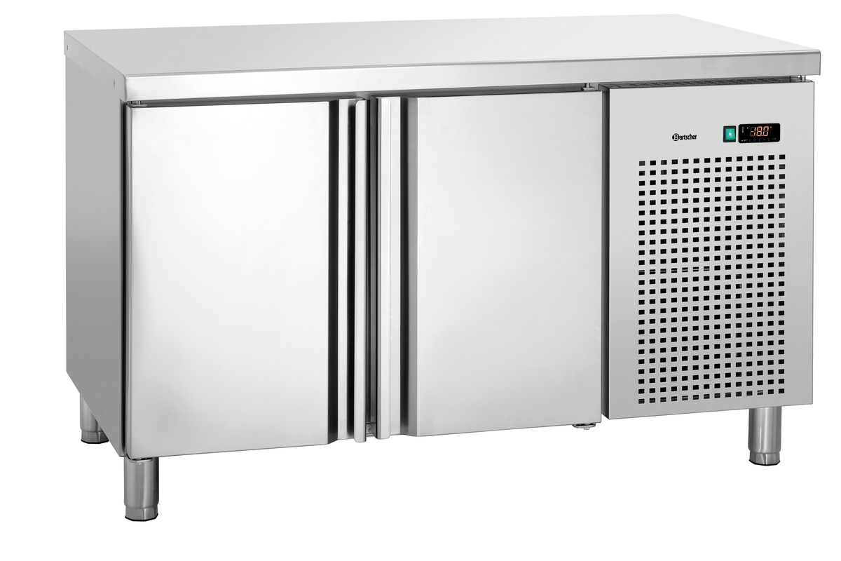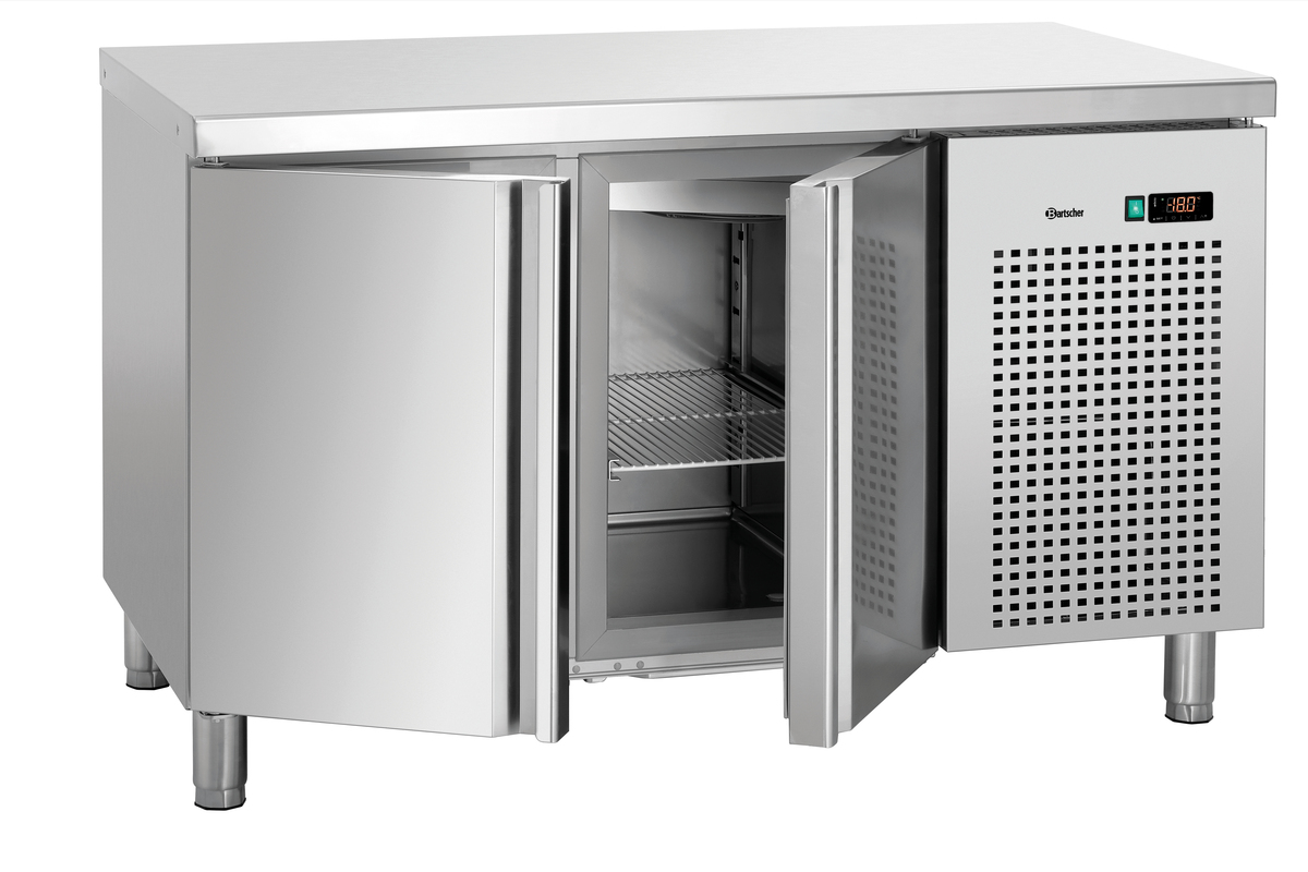 This 2-door freezer counter, featuring a high-quality stainless steel work surface, provides ample and easily accessible space for frozen foods. With convection cooling, it maintains a constant and uniform temperature, making it a reliable partner for any kitchen.