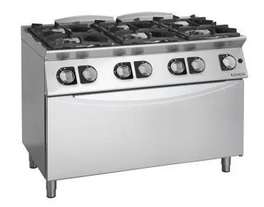 The Giorik ECG760H is a medium-duty, six-burner gas range equipped with a large-sized gas oven. This appliance is designed to meet the demands of a busy kitchen, providing ample cooking space and reliable performance. The six burners allow for simultaneous cooking of multiple dishes, while the spacious oven accommodates larger meals, making it ideal for both commercial and home use. With its robust construction and efficient functionality, the Giorik ECG760H ensures consistent cooking results and durability.