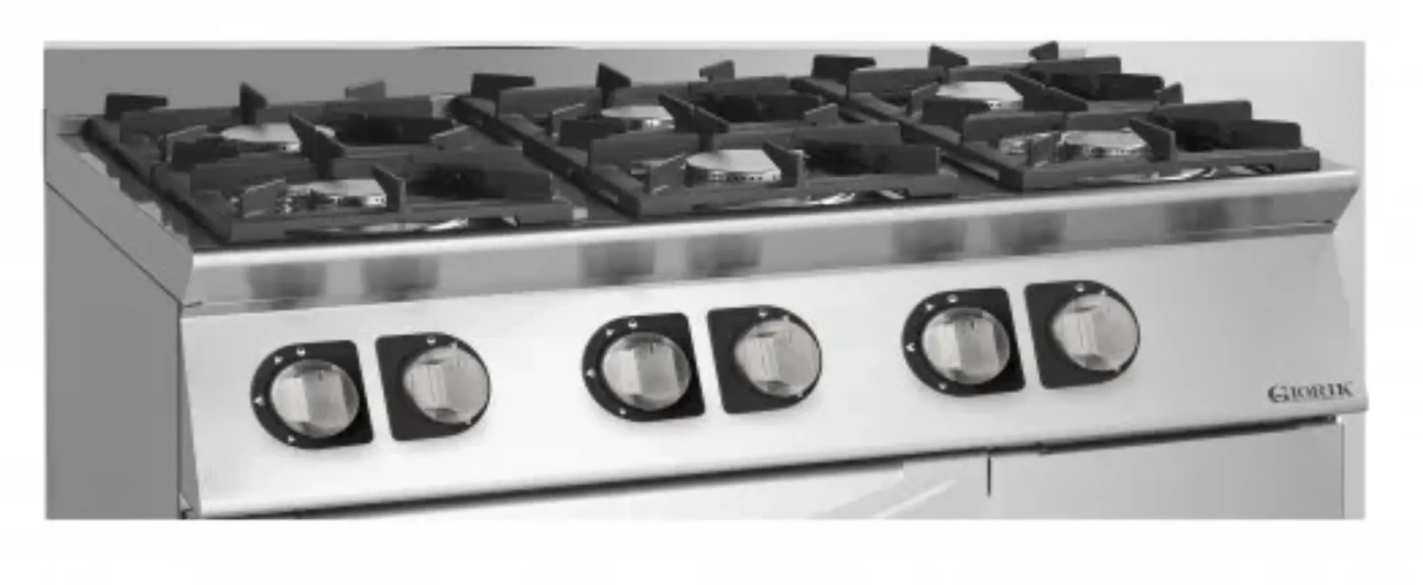 The Giorik ECG760T 6 burner gas boiling top is designed with quick and easy cleaning in mind. It is fitted with an "All in one" 1.2mm thick pressed top and features an ergonomically designed front sloping control panel, allowing for easy viewing of the controls. The high-power burners provide the chef with an ideal cooking appliance.