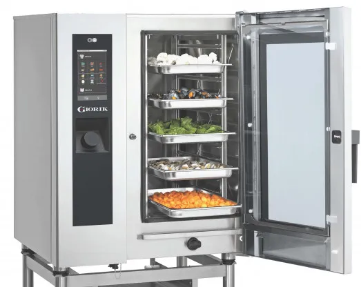 The Giorik SERG101 Steambox Evolution is a gas combi oven equipped with 10 racks. It features easy-to-use touchscreen programmable controls, a core cooking probe with Delta T, and a retractable hand shower. It is essential to fit the oven with a water treatment system.