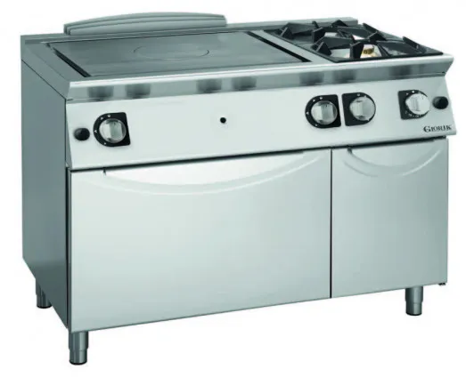 The Giorik 76FTGR is a medium-duty solid top range equipped with two open burners. It features a high-powered central burner that facilitates quick cooking, while the outer area is designed to keep pans on a simmer. The central burner cover is removable, allowing for the use of a wok pan if needed.
