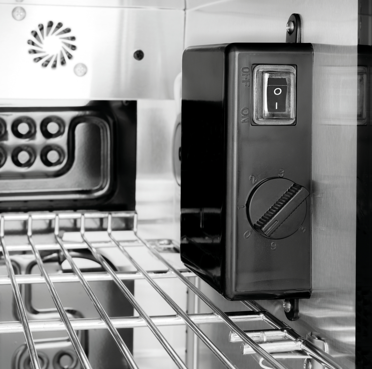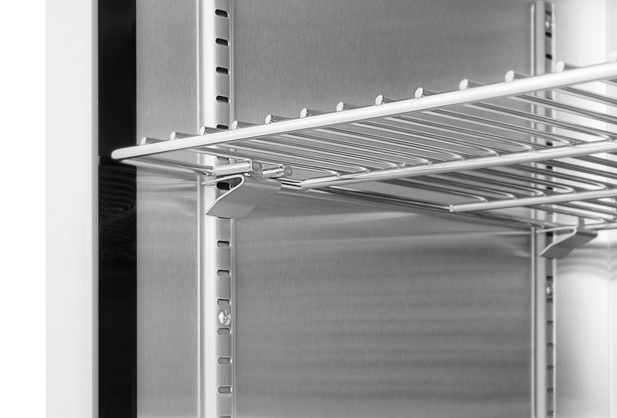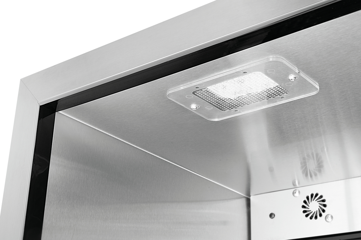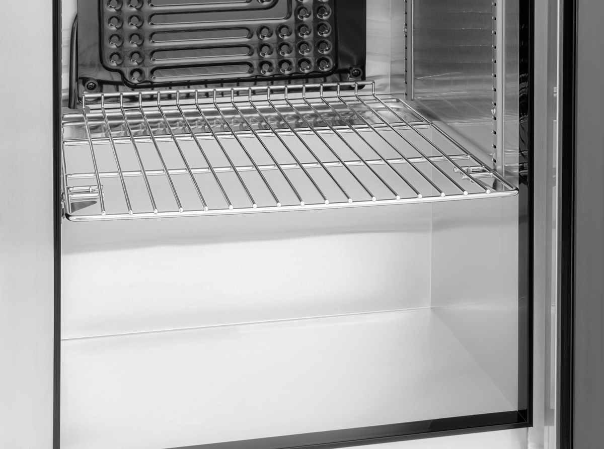 The compact glass-doored refrigerator, featuring a modern design, is a captivating addition to any BBQ or cooking event. It allows drinks and food to be stored at a cool temperature on three shelves, positioned behind a door with UV filter glass.
