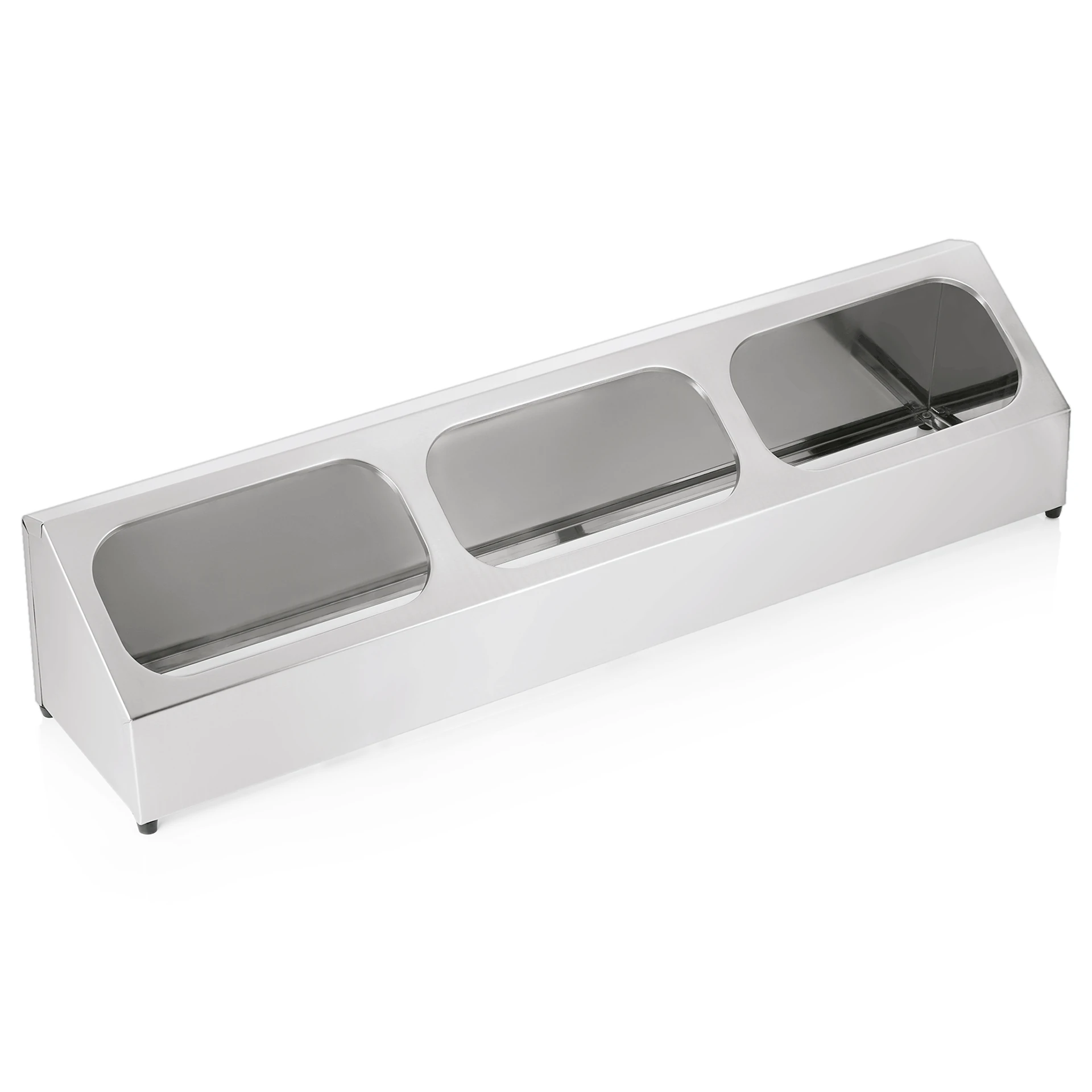 This product is designed to accommodate six GN pans of 1/6 size or three GN pans of 1/3 size, with a maximum depth of 150 mm. The front height of the unit measures 12.5 cm, while the rear height is 24 cm.