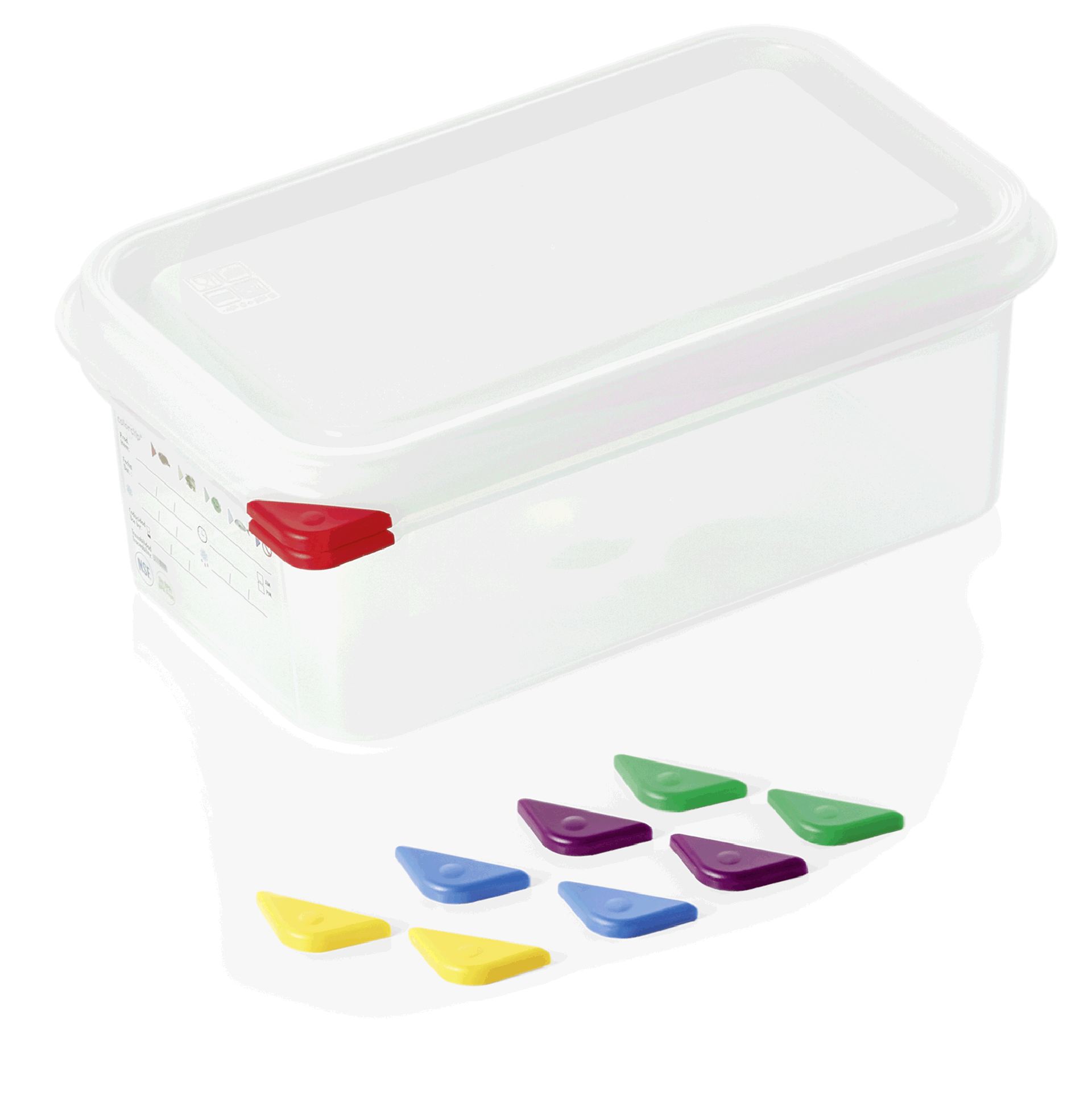 The product features a BPA-free, hermetically sealing lid, ensuring the contents remain fresh and secure. It includes five color-coding clips in red, blue, yellow, green, and purple, allowing for easy organization and identification. The containers are designed to be written on, providing a convenient way to label contents. Additionally, they come with scaling for precise measurements.