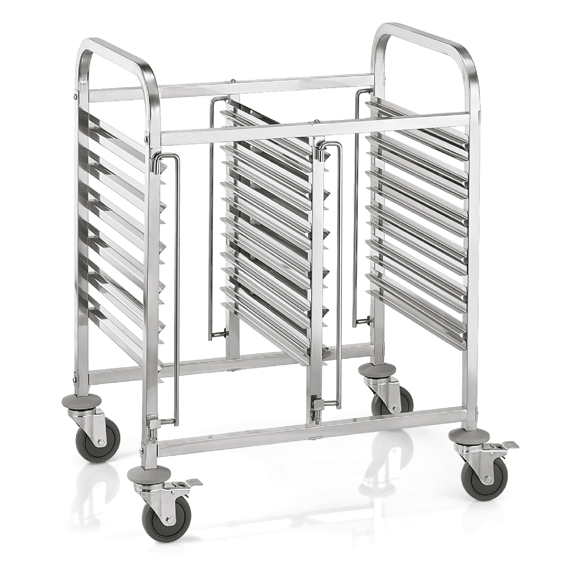 This product is designed to accommodate 12 containers or 24 trays. It features four swivel castors, each with a diameter of 12 cm, and includes bumpers for added safety. Two of the castors are equipped with brakes and a safety catch to prevent the containers or trays from slipping out, ensuring secure and stable transportation.