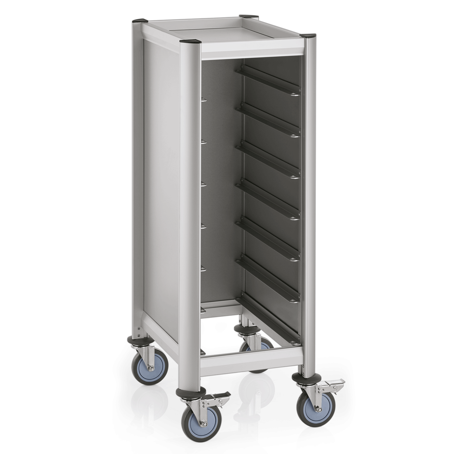 The product features aluminum profiles with MDF side panels, designed to accommodate seven trays. It is equipped with four swivel castors, each with a diameter of 12 cm, and includes bumpers for added protection. Additionally, two of the castors are fitted with brakes for enhanced stability and control.