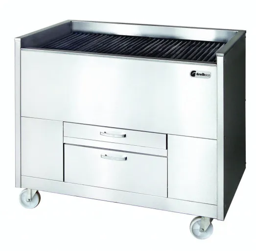 The Grelhaco charcoal chargrills are available in two designs. One is specifically designed for chicken, featuring a space of 240mm between the charcoal bed and the cooking grates. The other is a meat/fish version with a 120mm space. The increased spacing in the chicken model allows cooking to be done with less "flare up," as the fat burning occurs further away compared to the meat version.