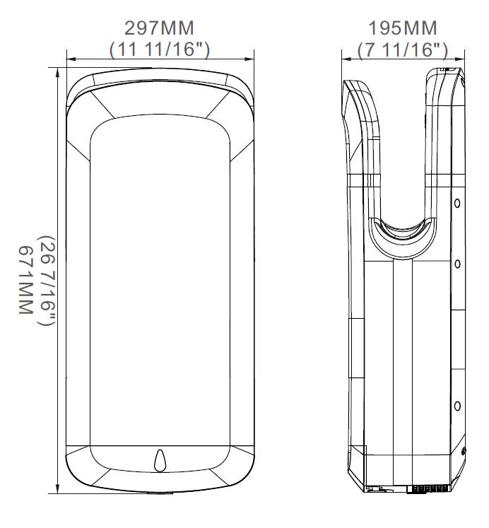 The stainless steel hand dryer features a classic modern design and offers both hot and cold air options. It ensures very fast drying times due to its impressive air speed of 600 km/h. This hand dryer provides a 90% savings on paper towels and includes a HEPA antibacterial filter for enhanced hygiene.