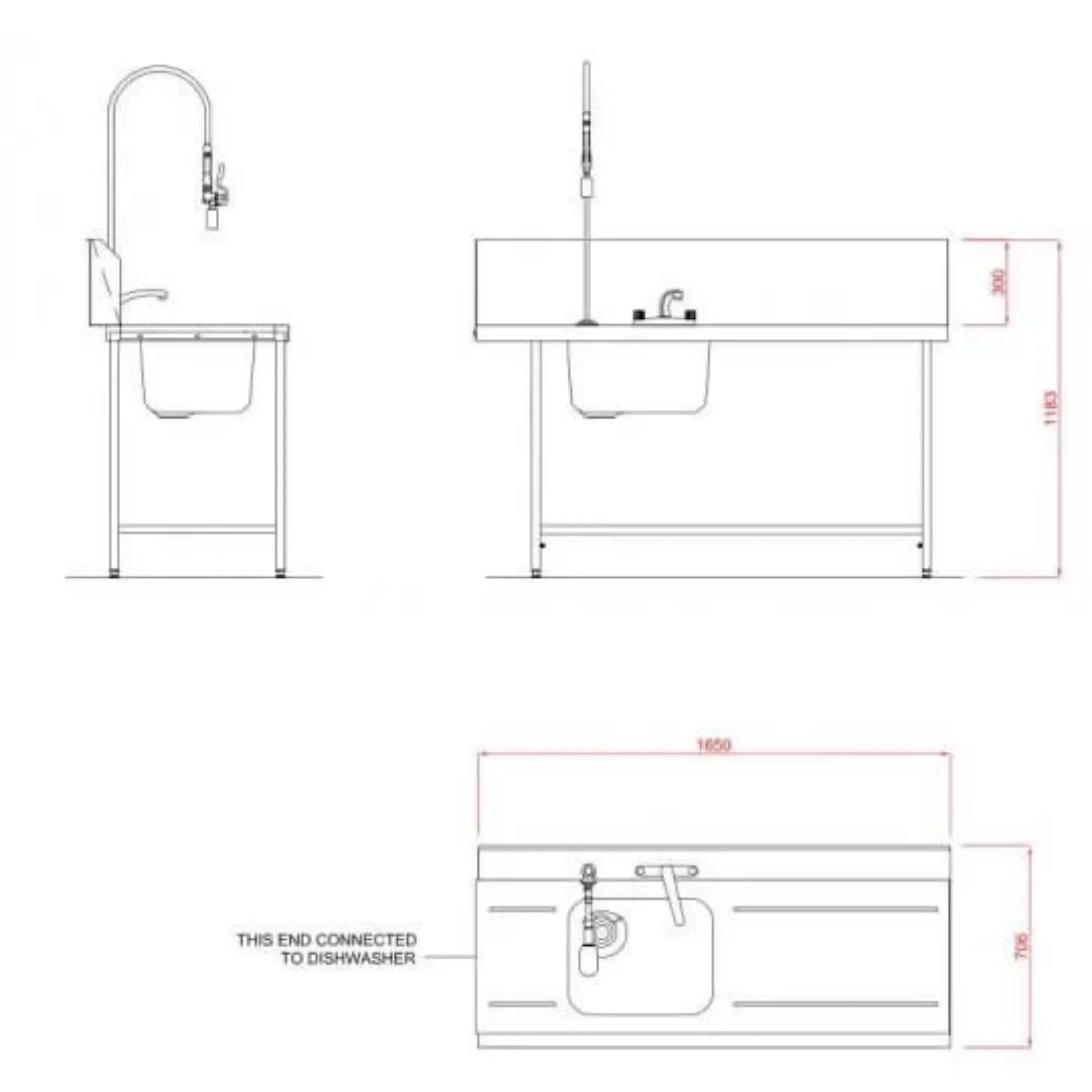 The Hobart SD1650R/L Inlet Triple Rack Table & Sink features welded, high-grade stainless steel tabling. It includes a sink bowl with a separate splashback.
