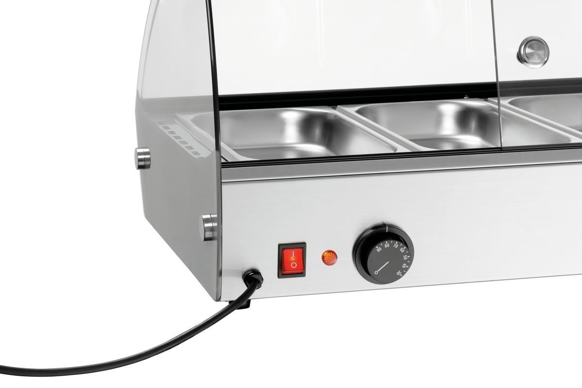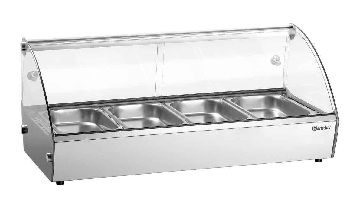 The small but fine space-saving glass display unit is designed for displaying and presenting hot meals.