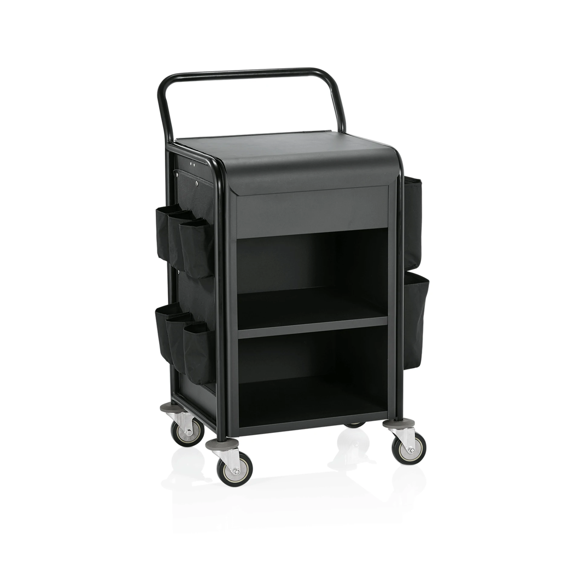 This product features four swivel castors, two of which are equipped with brakes for added stability and control. The upper compartment is designed with divisions for organized storage and comes with a cover for protection. The entire unit is finished with a sleek black powder coating, ensuring durability and a modern aesthetic.