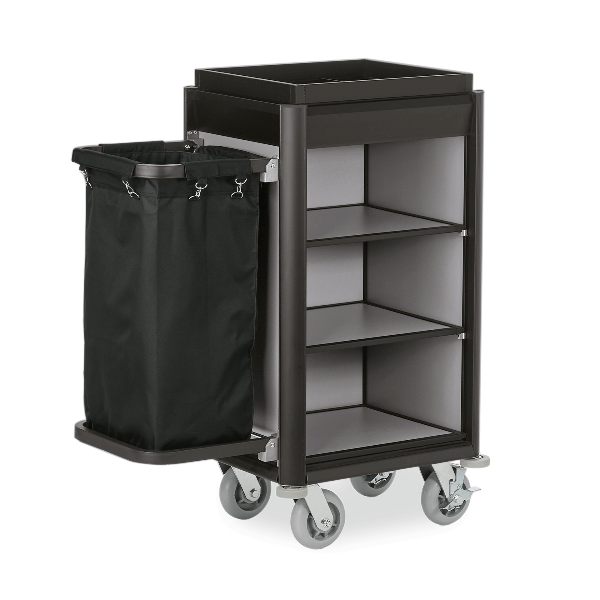 The product features a top tray made of aluminum with customizable divisions and edging strips also crafted from aluminum. The shelves and side panels are constructed from MDF. The dimensions for the shelves on model 001 are 50 x 44 cm, while the shelves on model 002 measure 72 x 44 cm. When the laundry bags are folded in, the length for model 001 is 64 cm, and for model 002, it is 90 cm. The product is equipped with two swivel castors, each measuring 15 cm and featuring brakes, as well as two fixed castors. Additionally, it includes bumper wheels and is designed with black edging strips that complement the aluminum look.