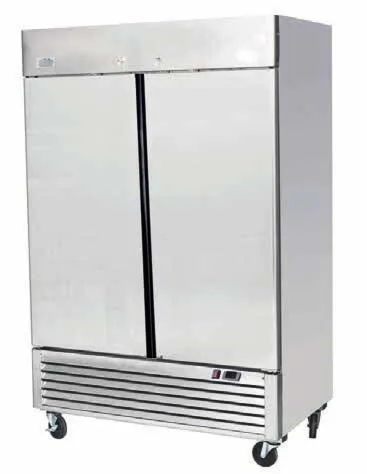 The Ice-A-Cool ICE8960 Double Door Upright Refrigerator is constructed with a stainless steel exterior and interior. It is equipped with self-closing and stay-open doors.