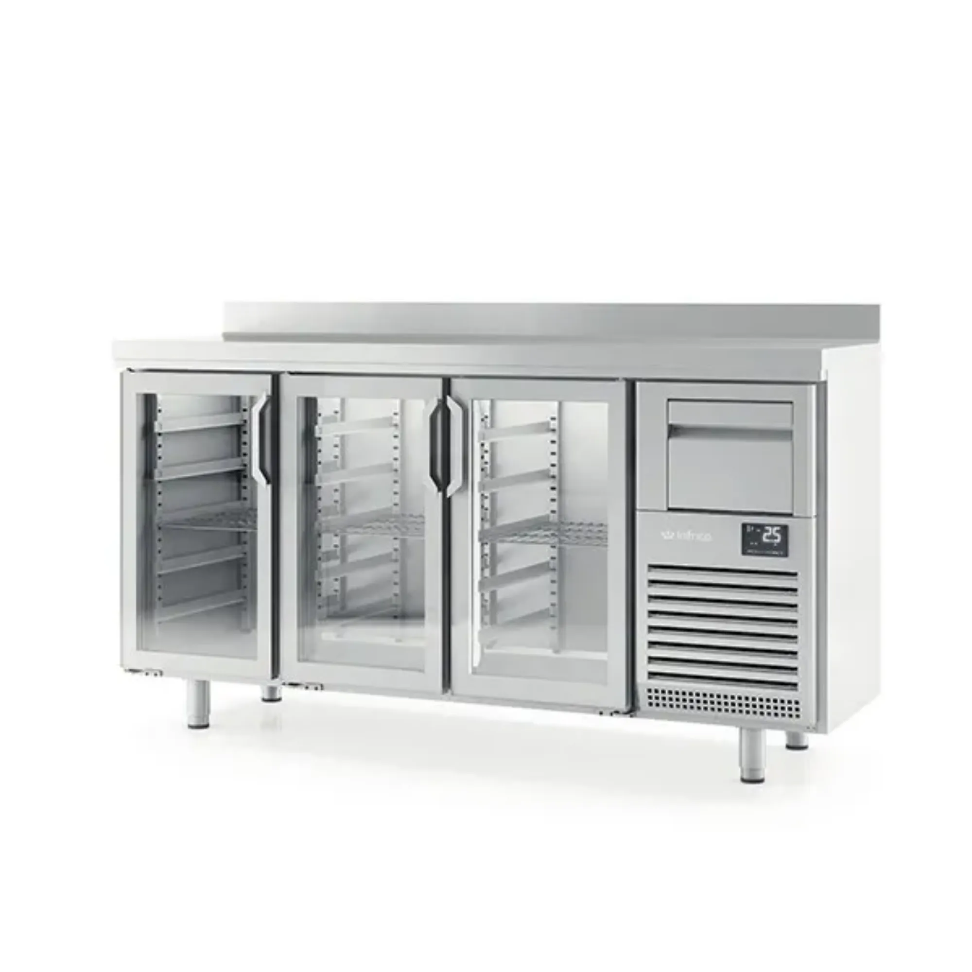 The Infrico FMPP2000CR 3 Glass Door Tall Back Bar Counter with Upstand 510L is constructed with high-grade AISI 304 stainless steel for both the exterior and interior. It is equipped with two shelves per door, each measuring 325mm x 430mm. Additionally, the unit features two neutral drawers positioned above the compartments. This model is enhanced with vertical LED illumination, providing excellent visibility and a modern aesthetic.