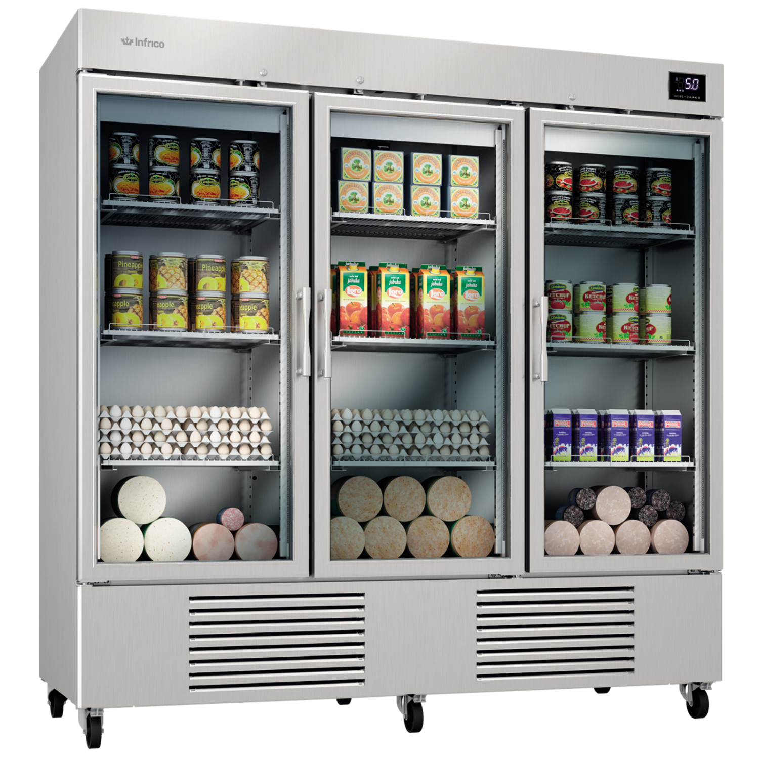 - Glass door format with efficient LED interior lighting for clear product visibility