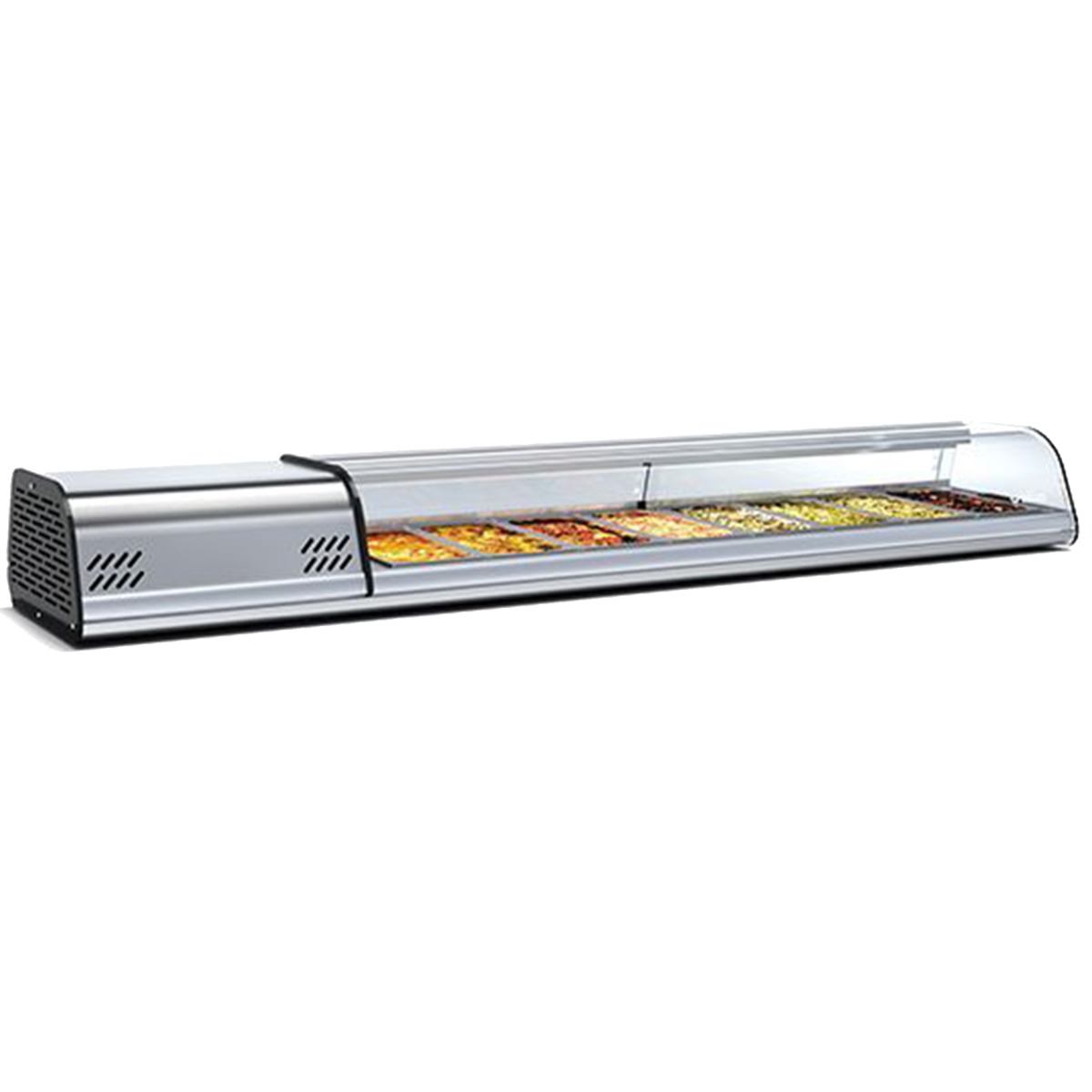 • Check iconAnodized aluminium silver colour exteriorAISI 304 grade stainless steel interiorSupplied with GN1/3 containers (40mm deep)LED illumination in top profileSliding rear doorsLifing curved front glass Brand: INFRICO Size (H x W x D): 230 x 1972 x 410 Weight: 57.0 Finish: Aluminium Controller: Digital controller with temp display Refrigerant: R134a Climate Class: 4 Defrost: Manual Temp Range: +4C/+8C Cooling: Static Power Consumption (W): 200W