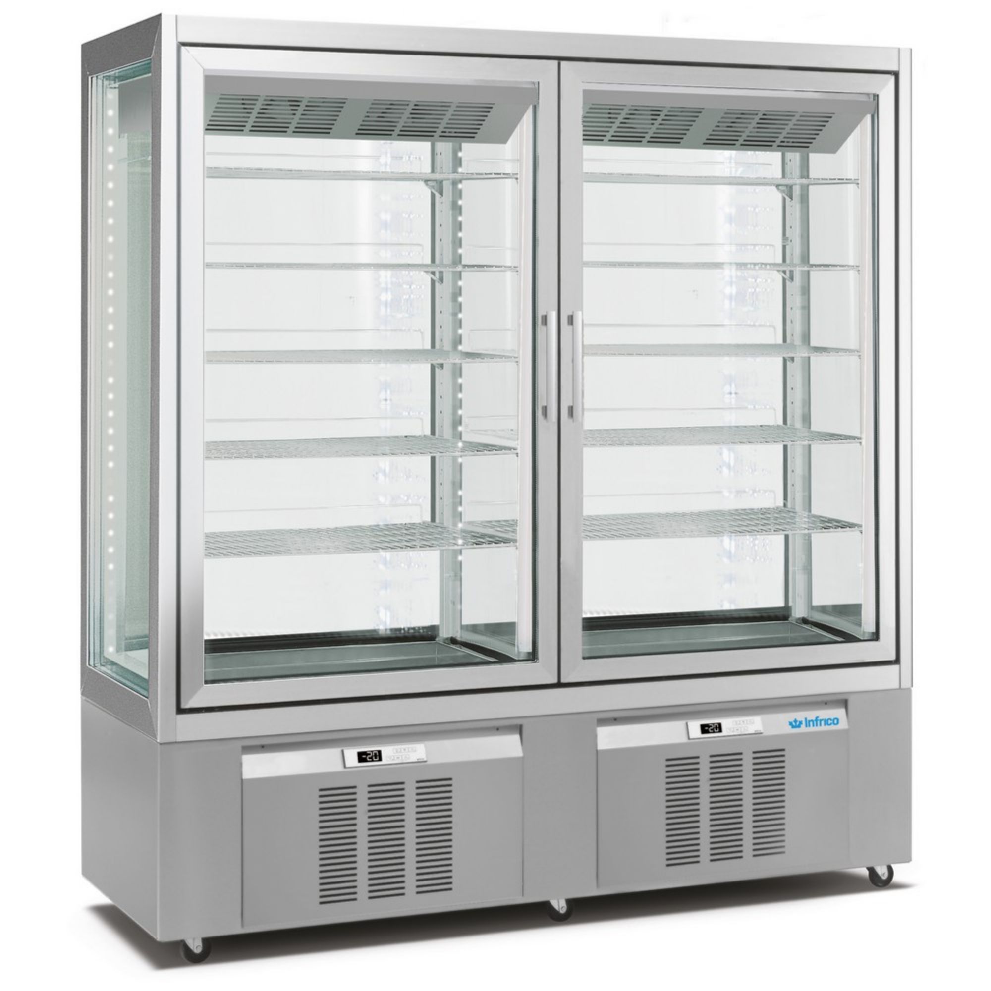 Inside, storage is designed for neat, adjustable merchandising. Each door includes five height-adjustable grills, with chromed grid shelves sized 730 × 450 mm for consistent presentation and easy reconfiguration as your menu changes.