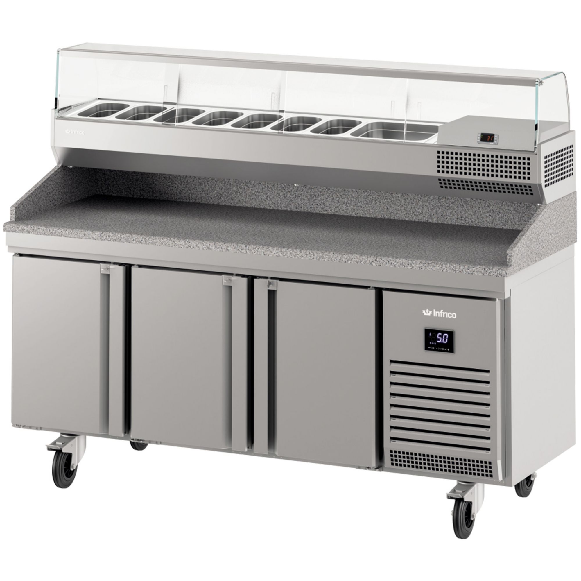 Built with AISI 430 stainless steel and a premium AISI 304 stainless steel countertop, itβs made to handle daily service while staying easy to wipe down between tasks. The compact, fully injected construction and polyurethane-injected worktop help support consistent operation, while the integrated space for G/N 1/3 trays keeps ingredients organised and within reach during busy periods.