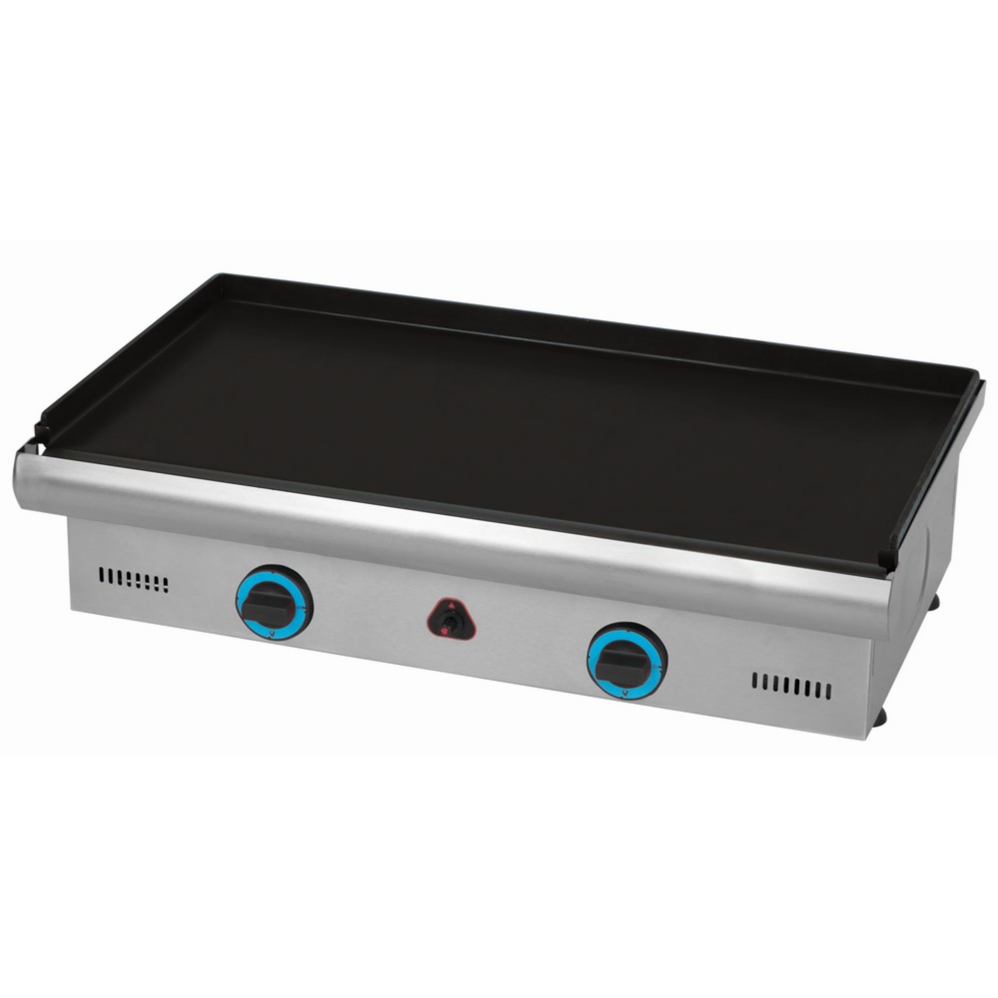 Heat distribution is supported by a horseshoe-style burner with dual flame outlets, helping maintain an even temperature across the plate. Operation is straightforward thanks to piezo ignition and gas valves offering two heat levels (high/low) for quick response during peak periods.