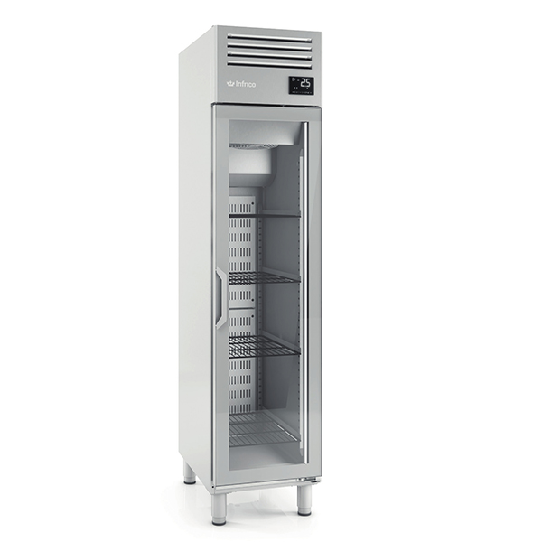 • Check iconHigh grade AISI 304 stainless steel exterior and interiorDouble glazed door4 shelves per doorInternal LED lightingRounded internal corners to aid easy cleaningReplaceable door gasketGlass may appear darker than images shown Brand: INFRICO Size (H x W x D): 2100 x 482 x 695 Weight: 136.0 Finish: Stainless Steel Controller: Digital controller with temperature display Refrigerant: R134a Climate Class: 4 Defrost: Automatic Temp Range: +2C/+6C Cooling: Ventilated Power Consumption (W): 372W Gross Capacity: 325 ltr