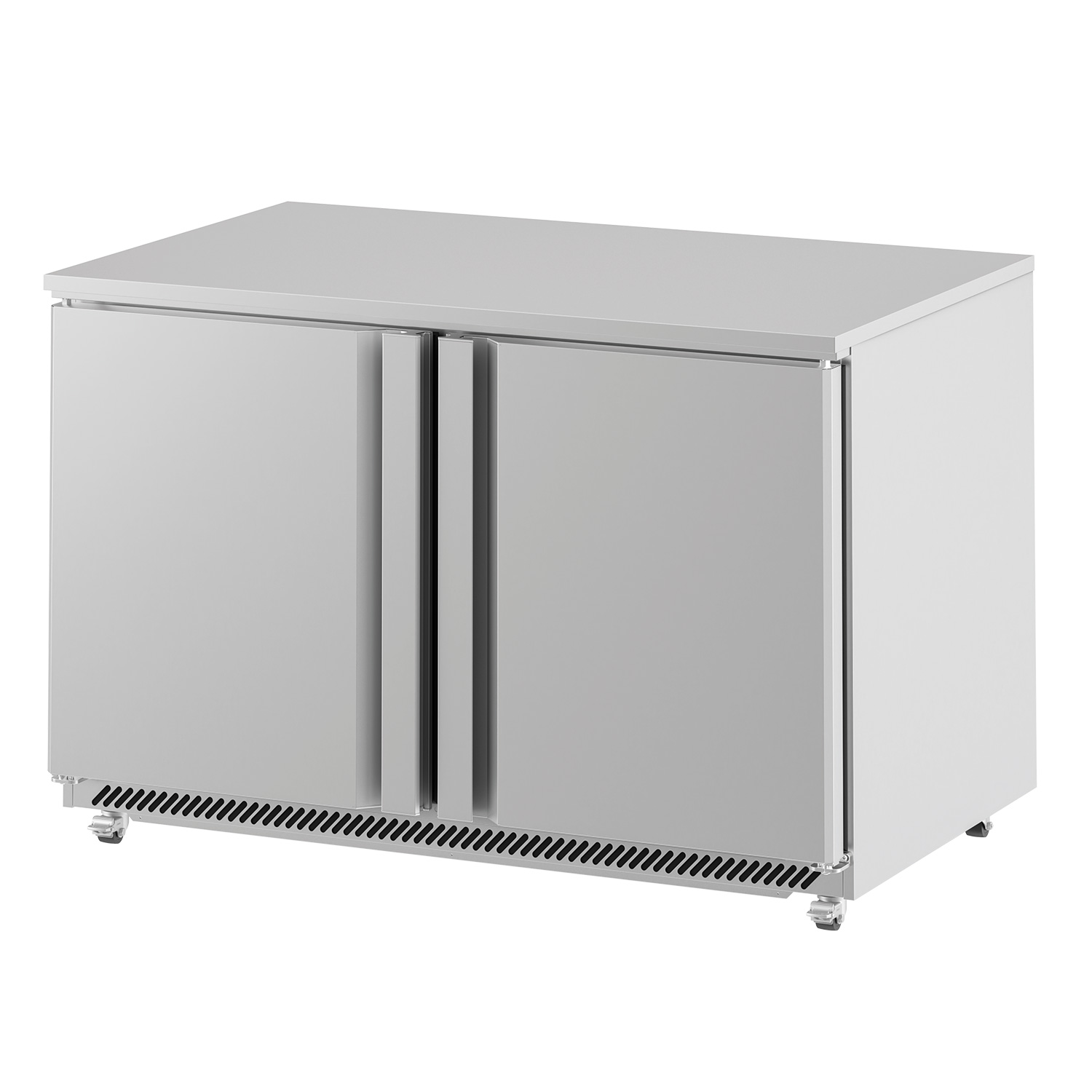 The worktop is made from AISI 304 stainless steel, with AISI 430 stainless steel on the sides, giving a durable, easy-clean finish that stands up to daily service. Its compact, fully injected construction supports consistent performance in demanding environments.