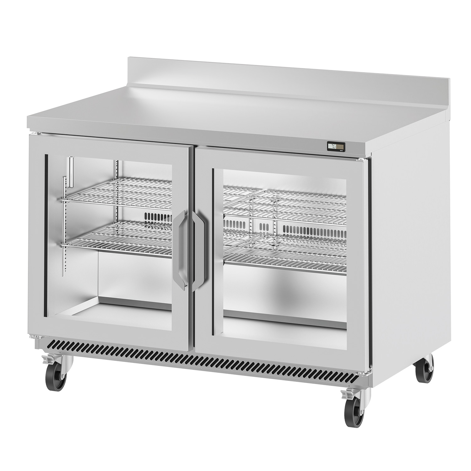 For practical usability on the pass or prep line, the unit sits on 100 mm castors, with brakes fitted to the front pair for stable positioning during service. Door performance is geared towards speed and hygiene: the hinges provide self‑return with consistent closing pressure, while still allowing free movement when opened beyond 95°. Doors are also reversible, helping you fit the table into tight kitchen layouts.