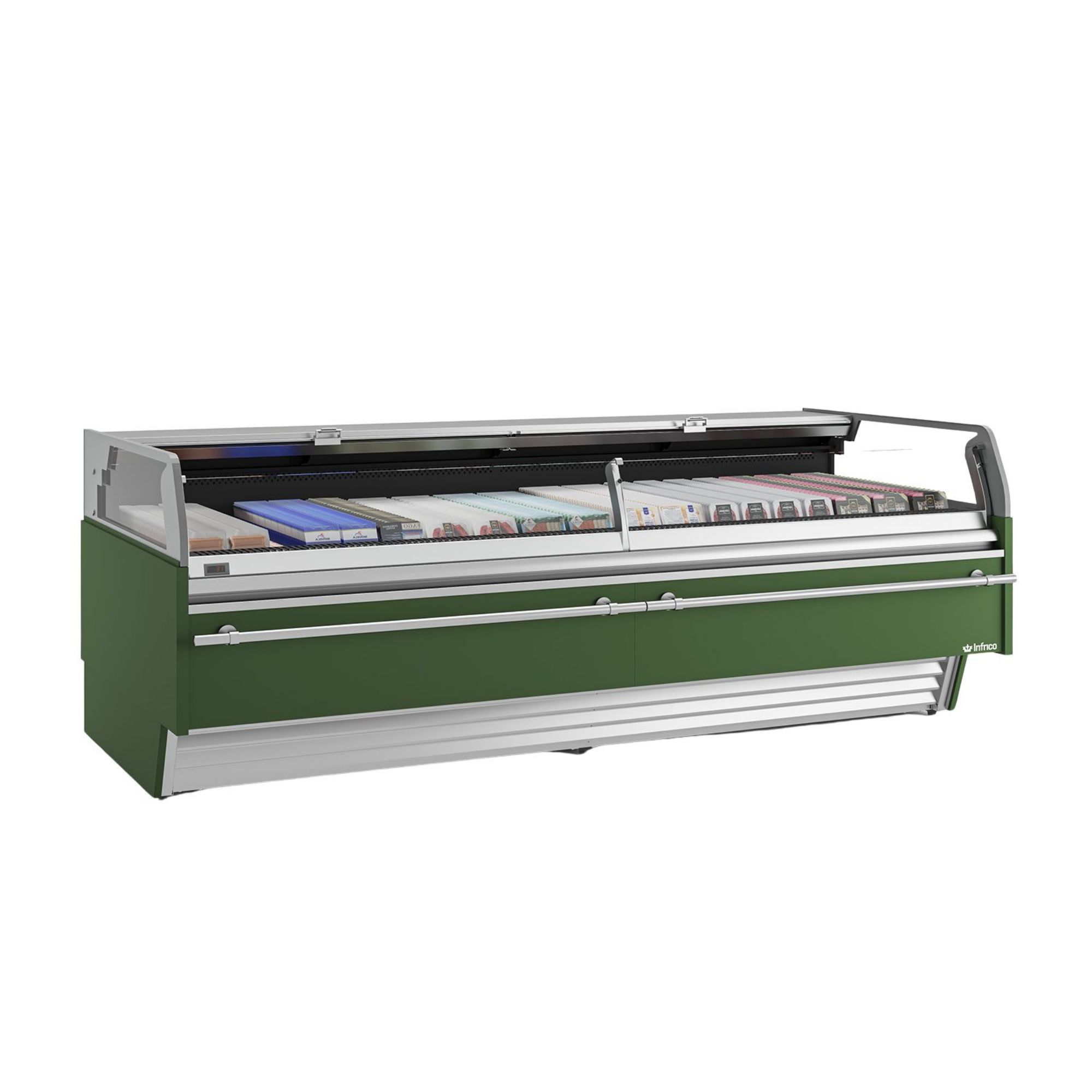 - Low, straight tempered glass for clear viewing and self-service