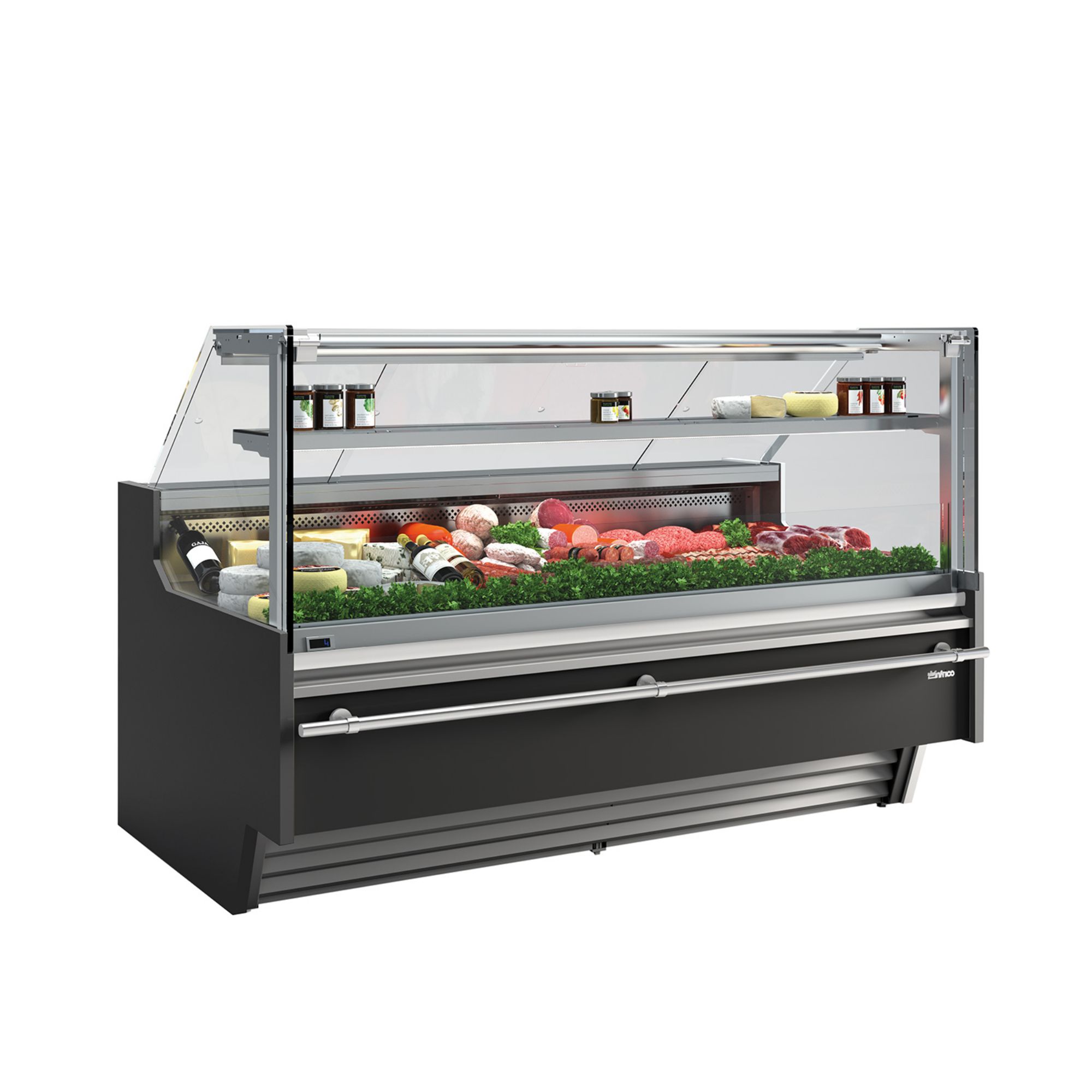 Infrico VBC 9 RICP (VBC9RICP) is a modular, cold ventilated display case in the Supermarket cases range (Barcelona, remote group), built for busy assisted-service counters where presentation and access matter. The curved glass front and raisable windows help staff serve quickly while maintaining a clean, professional barrier between customers and chilled produce.
