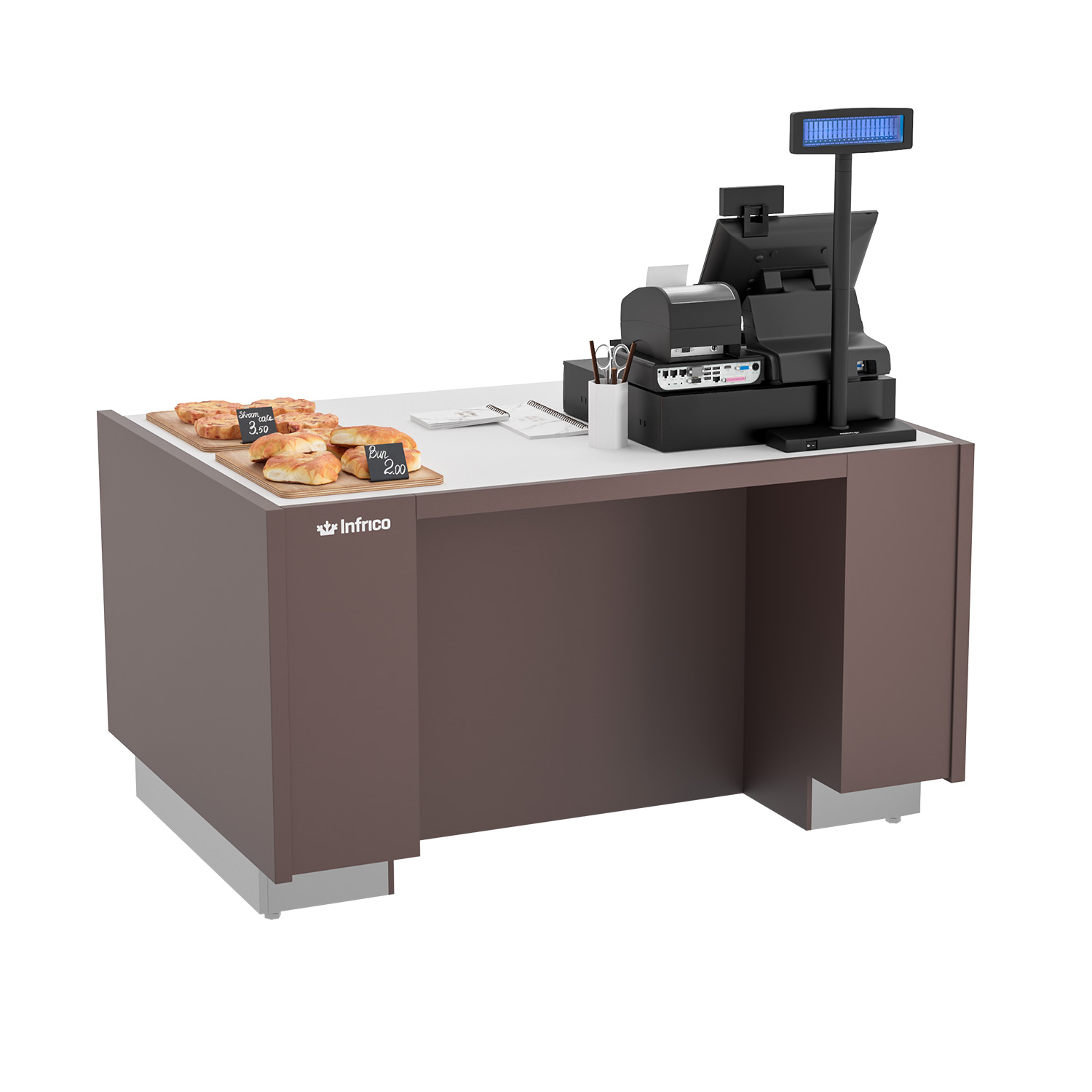 The worktop and bag support are made from white compac quartz, giving a clean, hard-wearing surface that suits modern counters and coffee stations. A straight-front glass screen with secured side glazing helps create a clear view of products while offering added protection in high-traffic areas.