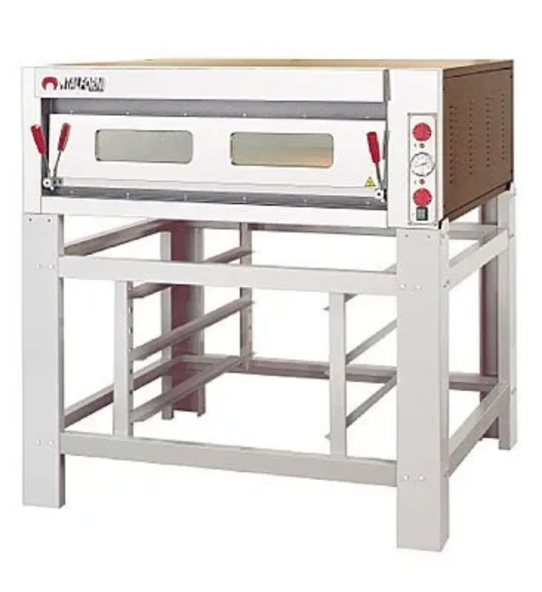 Heat is generated by upper and lower armored stainless steel heating elements, delivering a maximum cooking temperature of 450°C. The oven is internally lit by high-resistance halogen lamps and features a large counter-balanced door with a tempered glazed viewing window. The pizza oven is available in a stainless steel or rustic style finish and can be supplied with an optional stand or hermetic dough prover compartment.