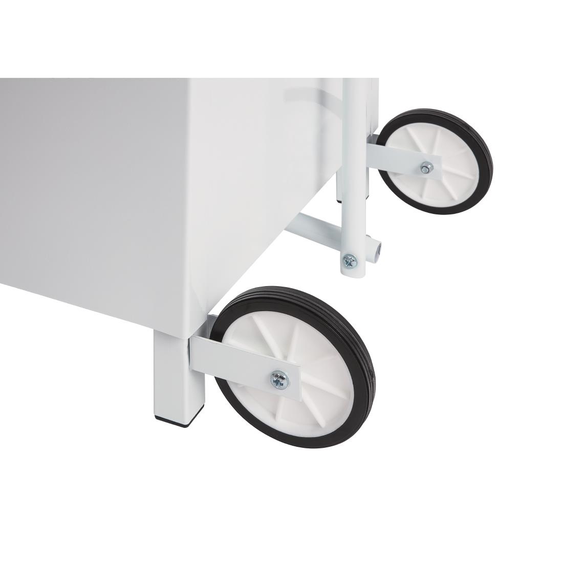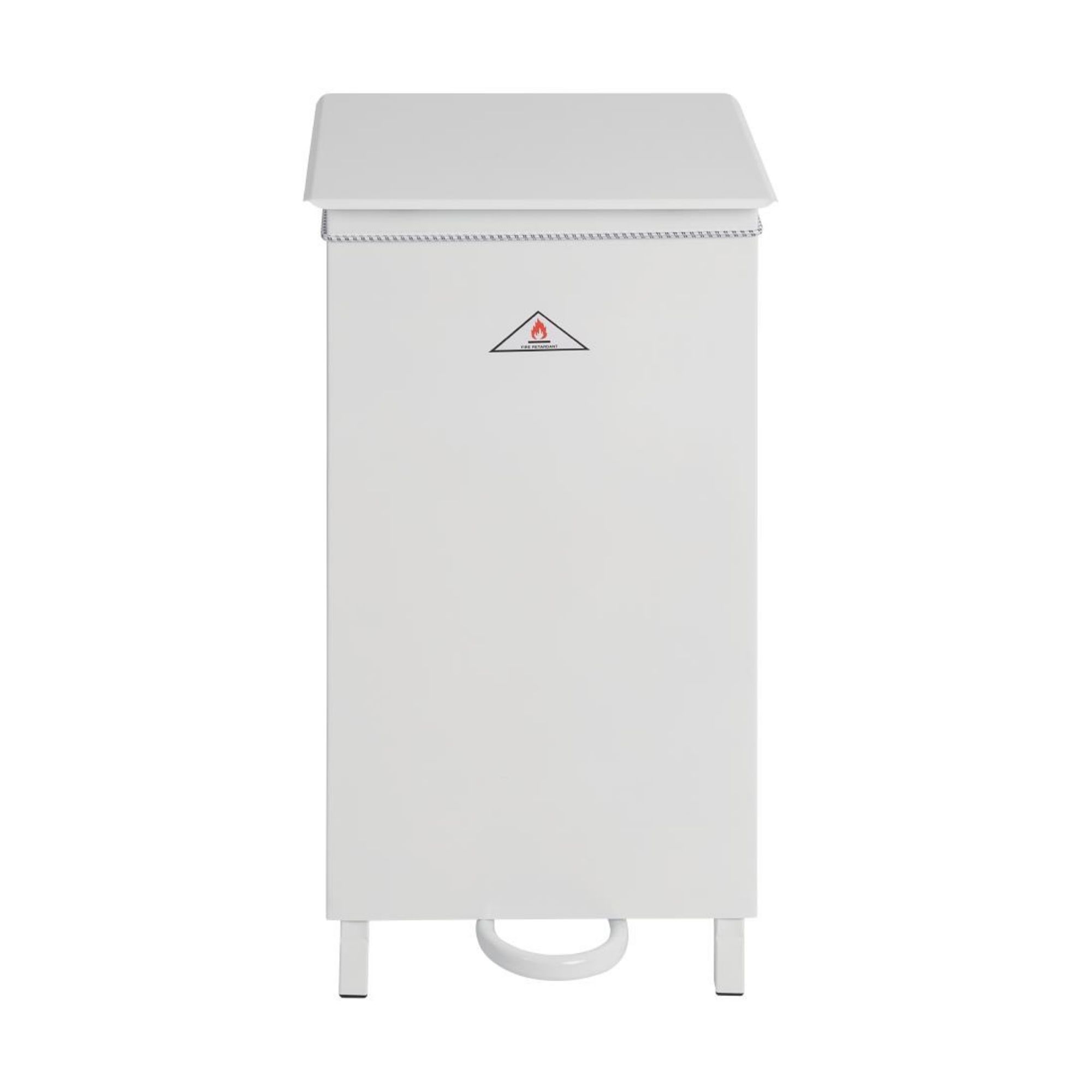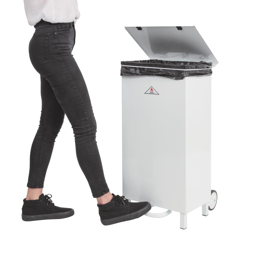 The Jantex sack trolley features a white painted, all-steel construction that is fire retardant, ensuring durability and safety. It includes an enclosed body and is operated with a foot pedal, providing convenience and ease of use.