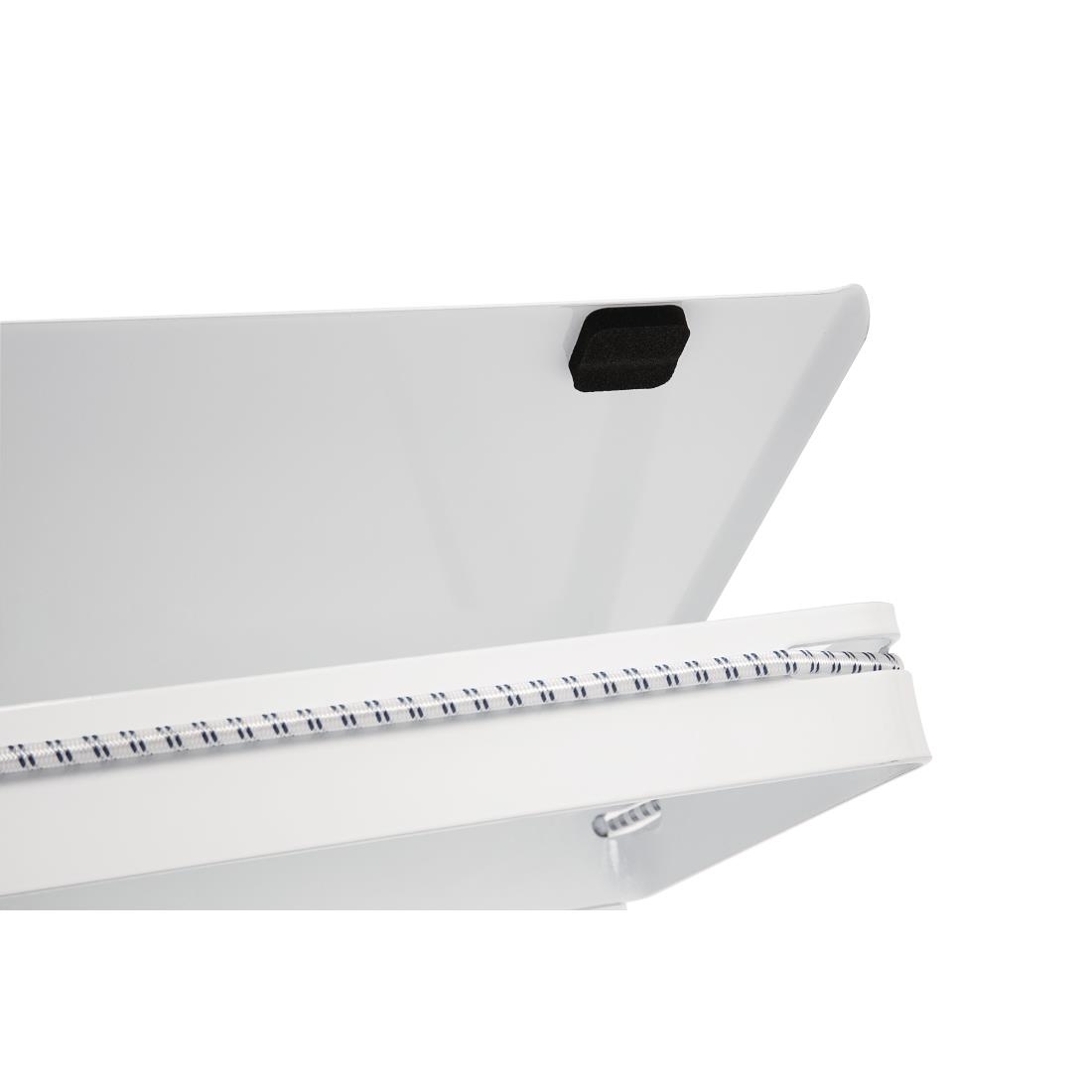 The Jantex semi-mobile sack trolley is designed with two wheels at the rear, allowing for easy movement. It features a foot control pedal that opens the lid, enabling hygienic, hands-free use.