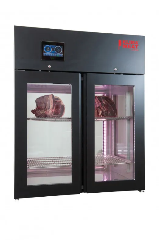 The Klima Food KMVE Dry Ager meat maturing refrigerator is ideal for dry aging beef and other cuts of meat with a slaughter age under two years. It achieves this by providing a controlled environment for the aging process. The refrigerator is fitted with a glass panel on the customer's side and finished in black, making it an ideal "Thru the Wall" display. By using the optional pH control probe, it is possible to treat different cuts of meat for varying time settings, allowing for the assessment of maturation levels for each cut of meat.