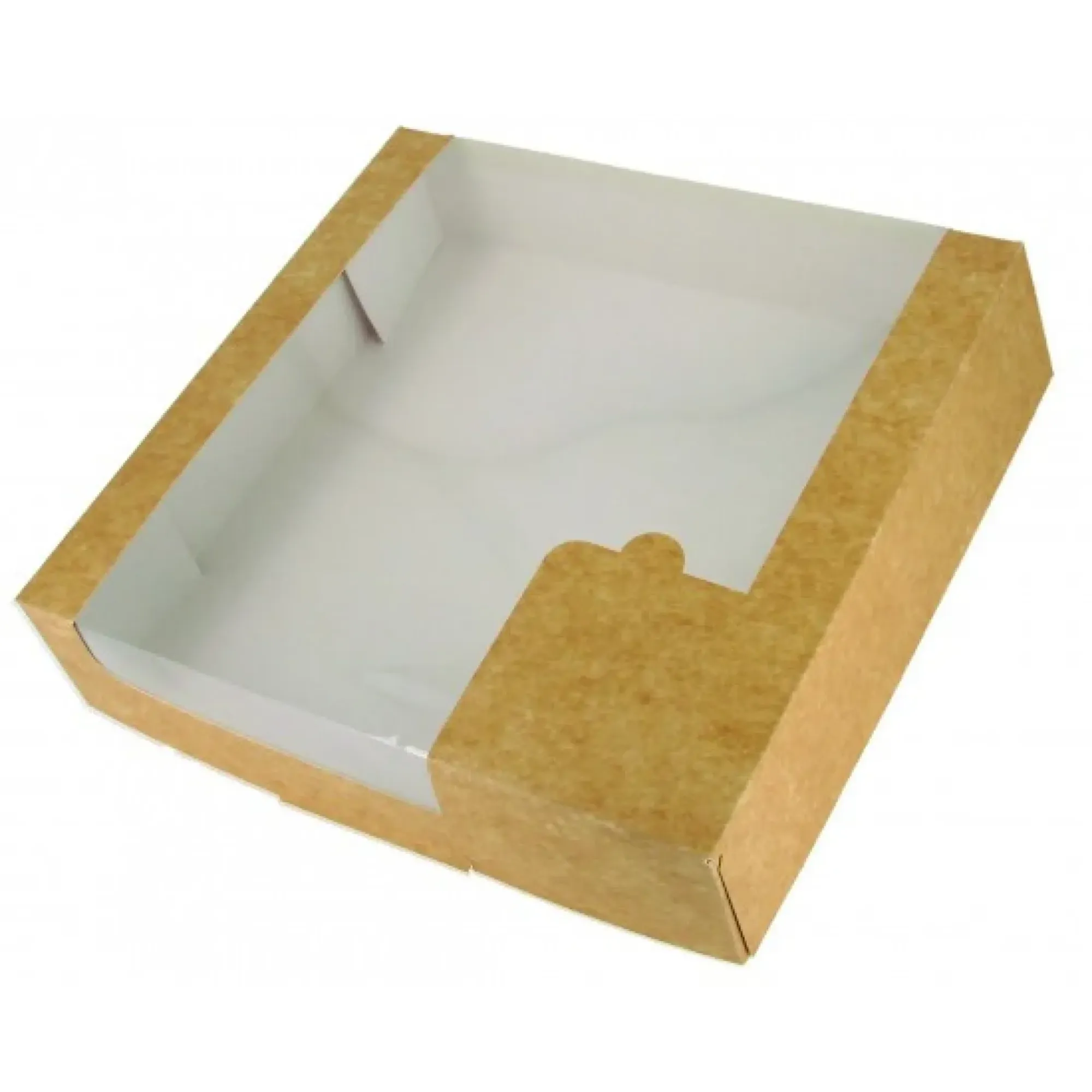 Large Kraft cake box. Pair with other sizes to display and offer a full range of cakes, tarts, and pies. Clear windowed lid shows off contents and allows for labeling.