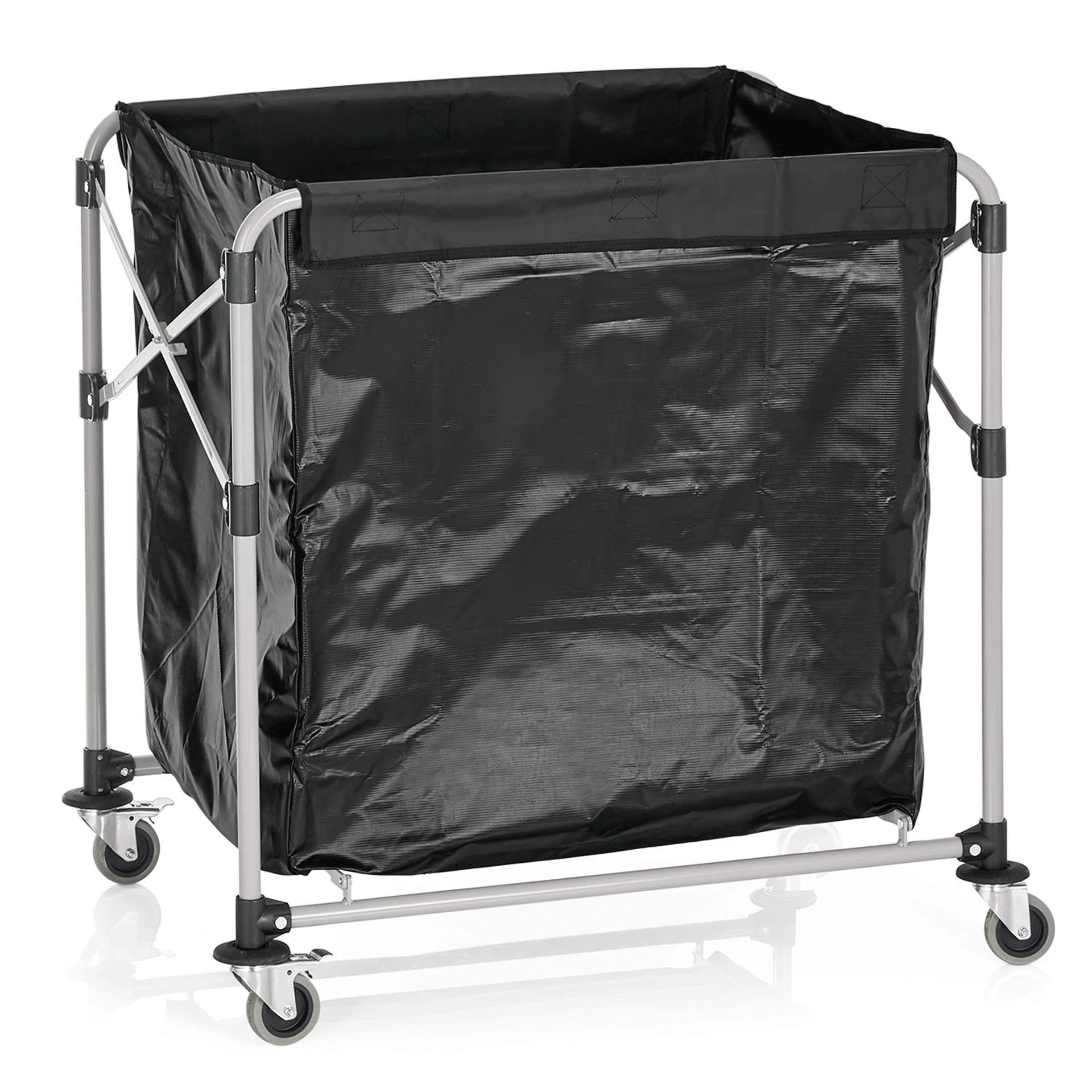 This product features a laundry bag equipped with four swivel castors, two of which have brakes for added stability. The design is collapsible, making it convenient for storage when not in use. The laundry bag is crafted from durable vinyl, ensuring longevity and easy maintenance. The frame is constructed from powder-coated iron, providing a sturdy and reliable structure.