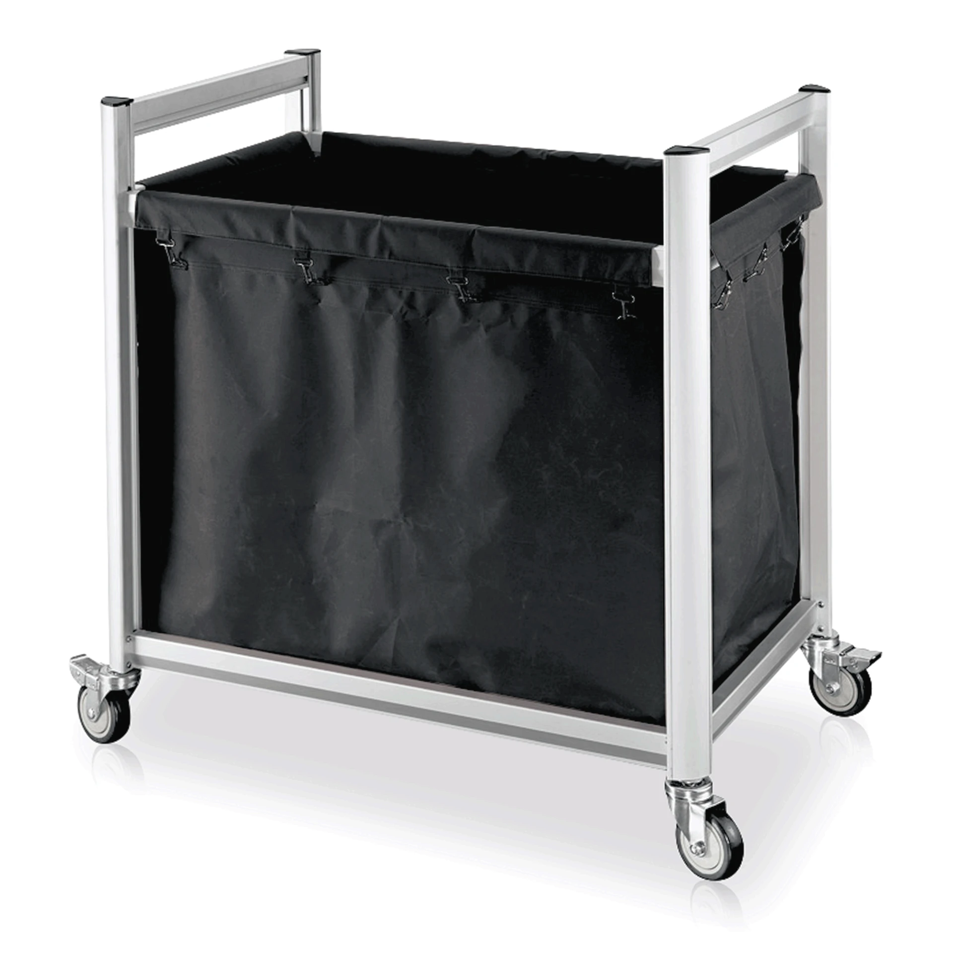 The laundry cart features four swivel castors, each with a diameter of 9.5 cm. Two of these castors are equipped with brakes for added stability. The cart includes a base plate and a polyester laundry bag, which is washable at temperatures up to 40°C.