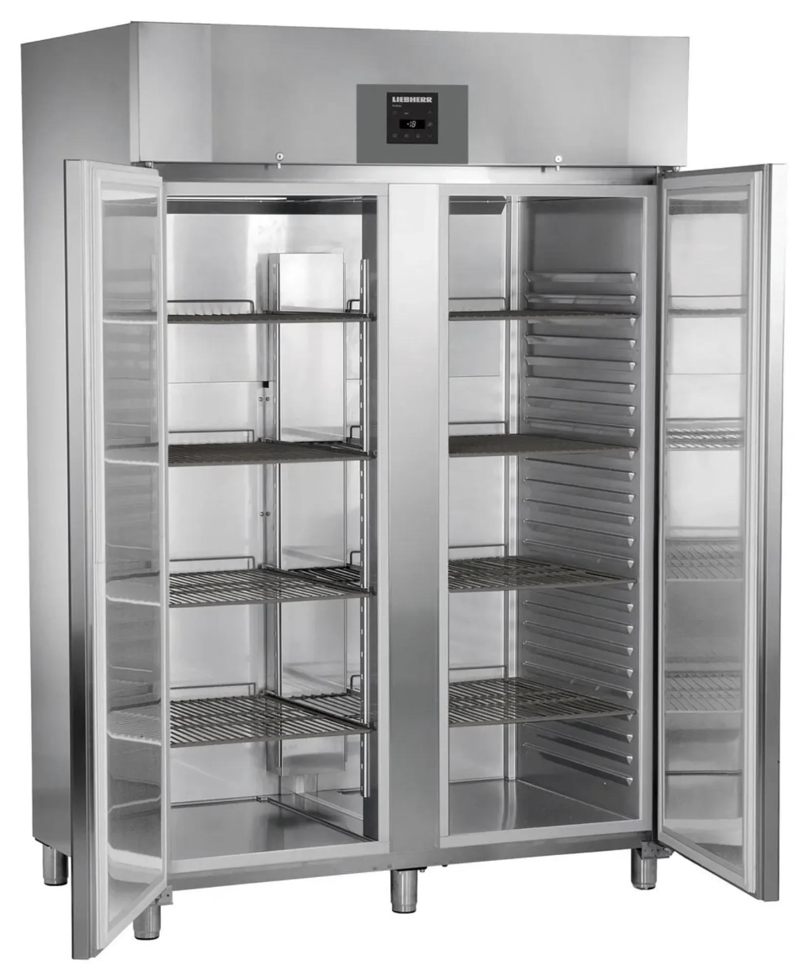 The Liebherr GGPv1470 freezer features professional quality and top performance as part of the Gastronorm Profiline range. High-quality refrigeration components combined with a forced-air system with twin fans guarantee even temperature distribution throughout the interior. The temperature can be set in a range of -2°C to +15°C in an ambient temperature of up to +43°C. These appliances meet professional storage requirements with large capacity and easily variable shelf positions.