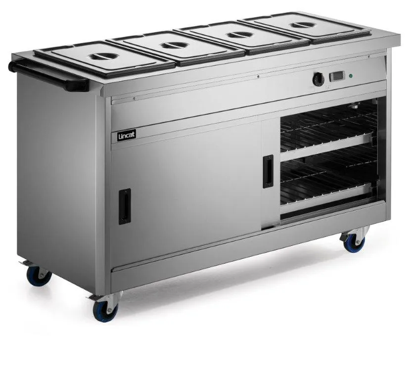 Lincat Panther hot cupboards are available in various lengths, offering options of either a plain top or a bain marie top, which can accommodate up to six standard 1/1 GN containers. These cupboards feature a digital temperature display and control, fan-assisted heating, and 1/1 GN compatible mirror stainless steel interiors.