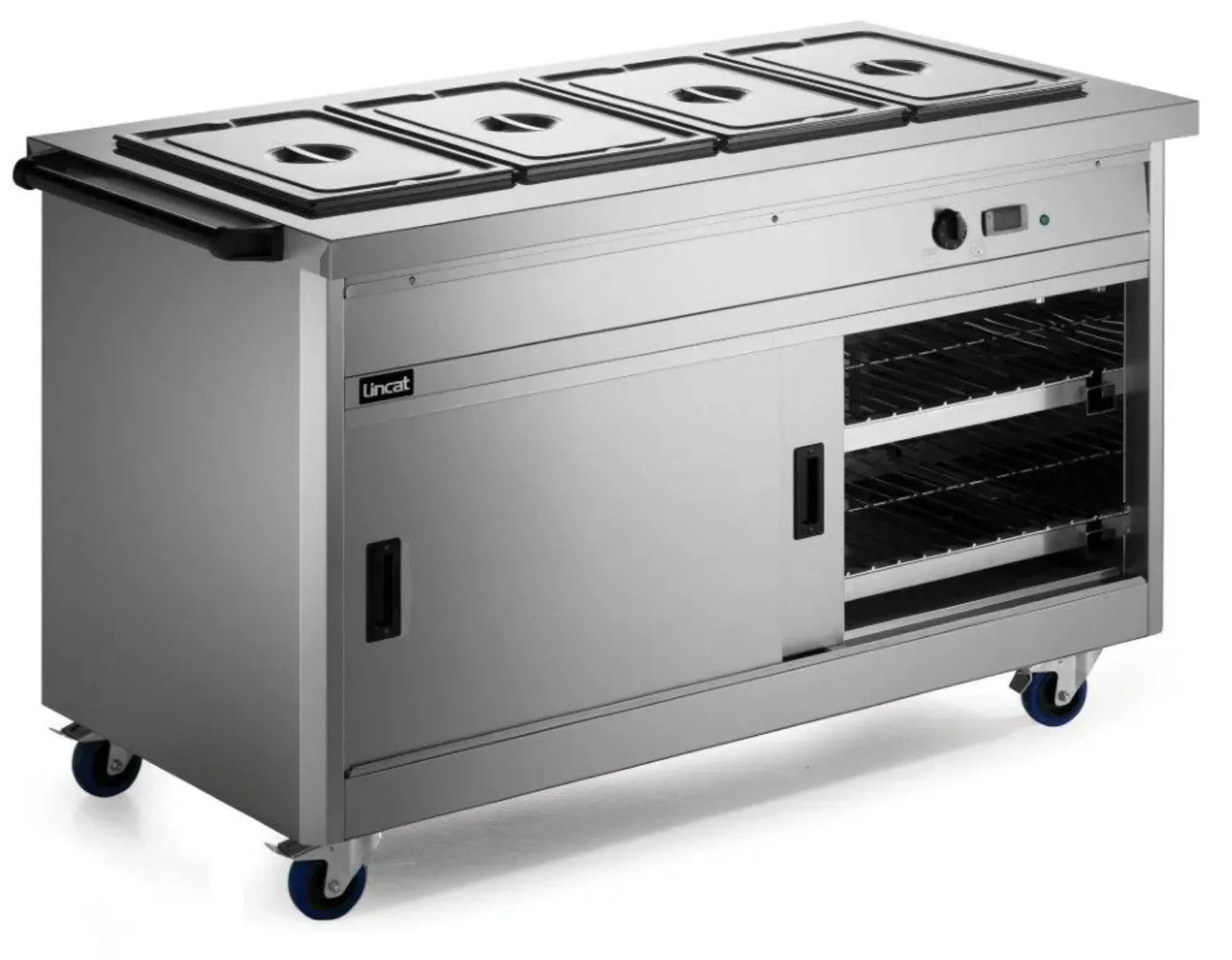Lincat Panther hot cupboards are available in various lengths, offering options of either a plain top or a bain marie top, which can accommodate up to six standard 1/1 GN containers. These cupboards feature a digital temperature display and control, fan-assisted heating, and 1/1 GN compatible mirror stainless steel interiors.