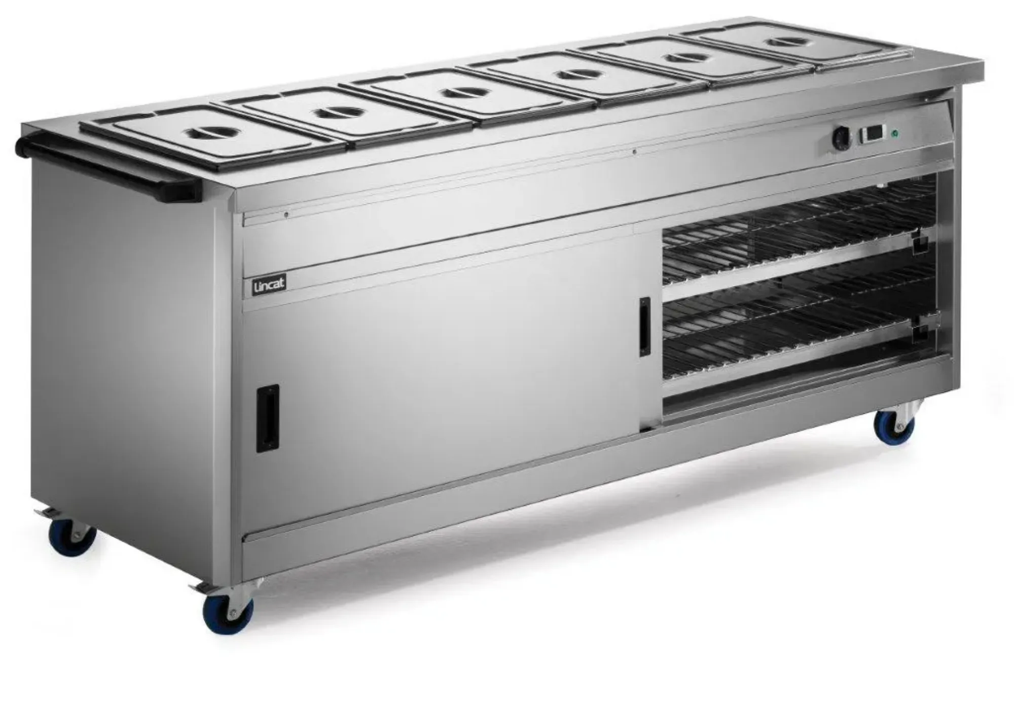 Lincat Panther hot cupboards are available in various lengths, either as plain top or bain marie top, which can hold up to six standard 1/1 GN containers. Features include digital temperature display and control, fan-assisted heating, and 1/1 GN compatible mirror stainless steel interiors.