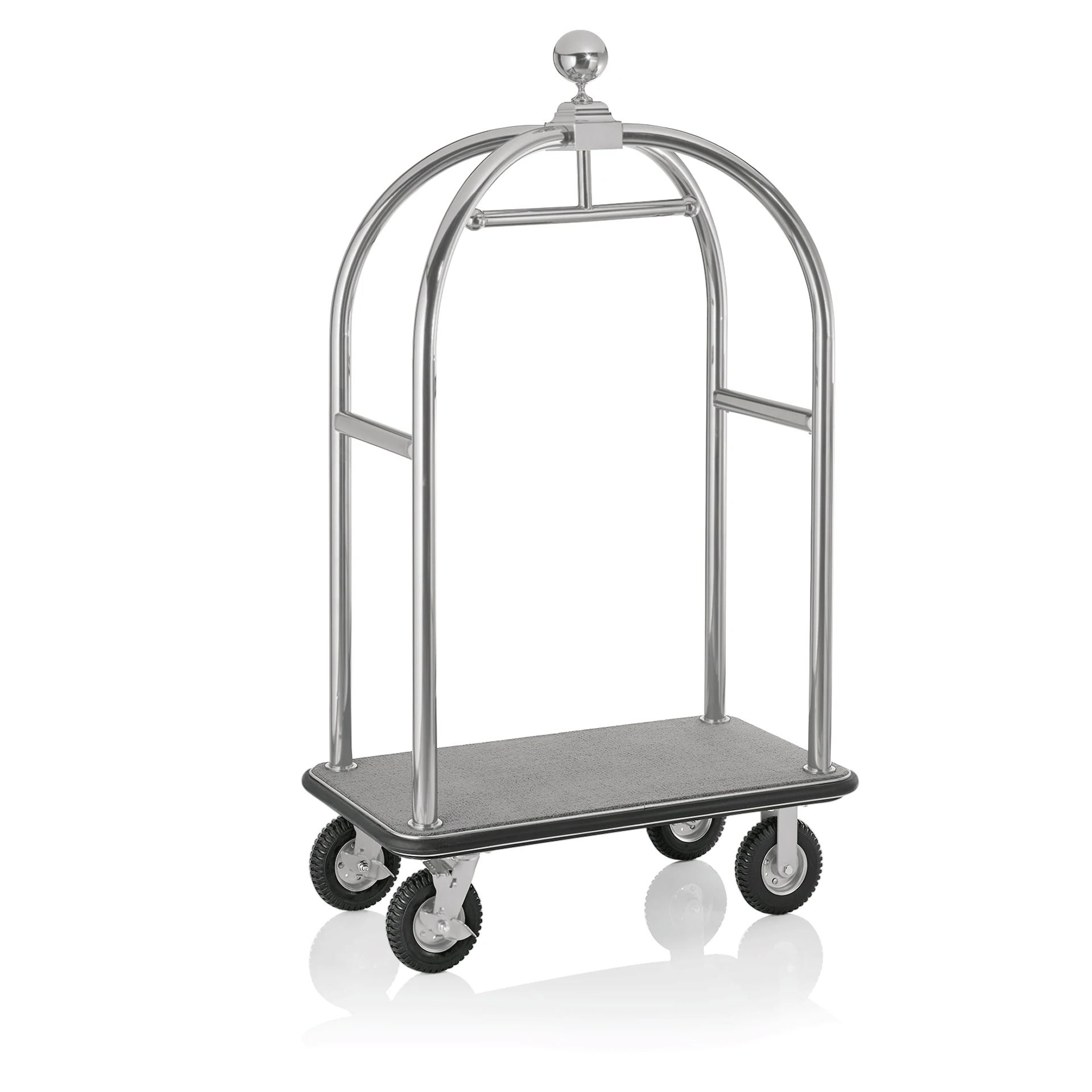 The product features a silver-coloured brushed finish and includes two swivel castors, each with a diameter of 20 cm, equipped with brakes for added safety. Additionally, it has two fixed castors for stability. The tubular frame has a diameter of 5 cm and includes an integrated coat rail for convenience. A rubber bumper surrounds the entire structure, providing protection and durability.