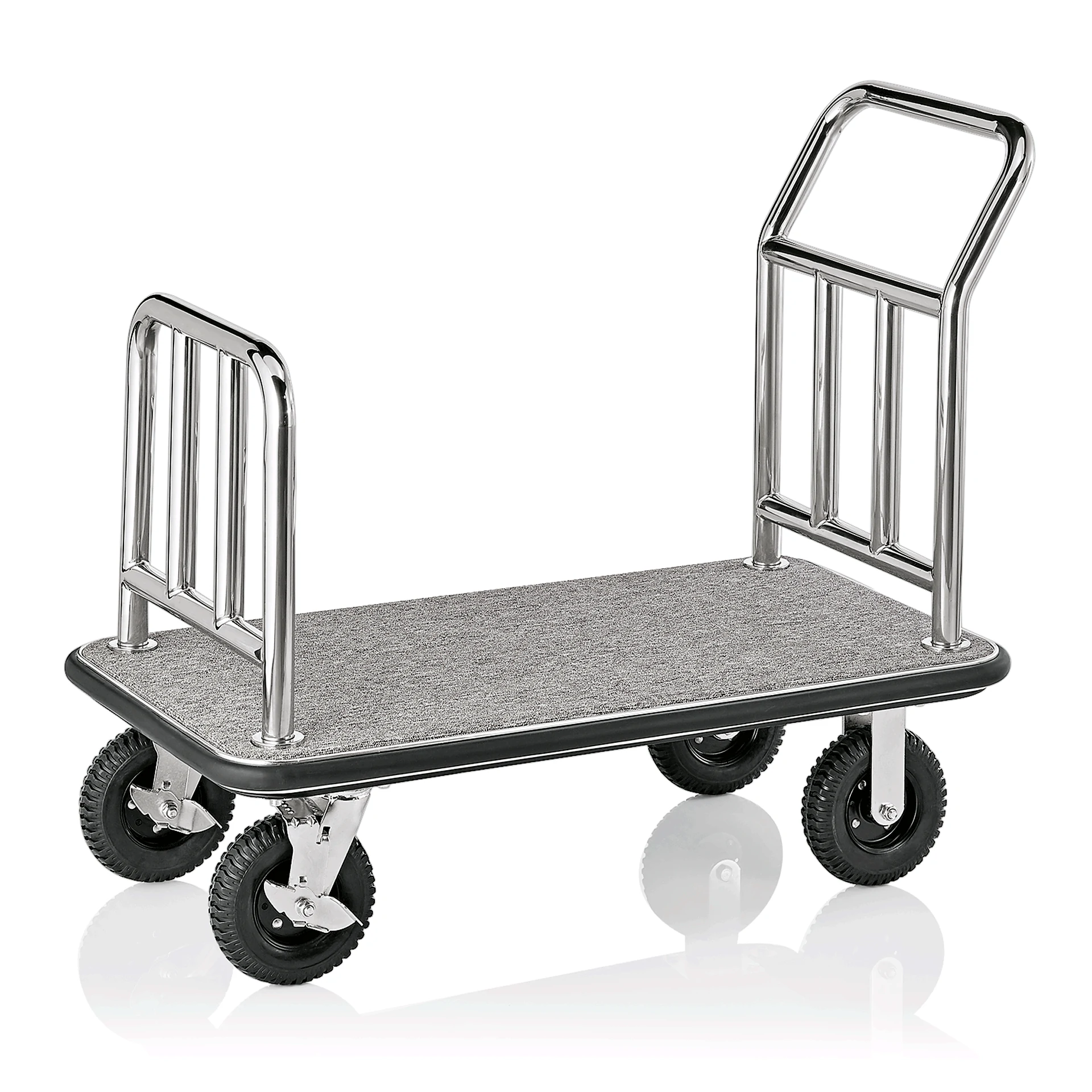 The product features a silver-colored design and includes two swivel castors, each with a diameter of 15 cm, equipped with brakes for added safety. Additionally, it has two fixed castors for stability. The tubular frame has a diameter of 3.8 cm, ensuring durability and strength. A rubber bumper surrounds the frame, providing extra protection and reducing the risk of damage during movement.
