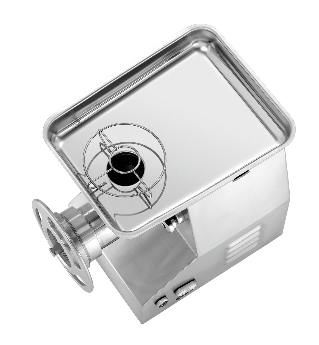This meat grinder, featuring an extra-large filling chute and a ventilated motor, is capable of producing up to 500 kg per hour. The removable mincing unit allows for HACCP-compliant storage in the refrigerator.