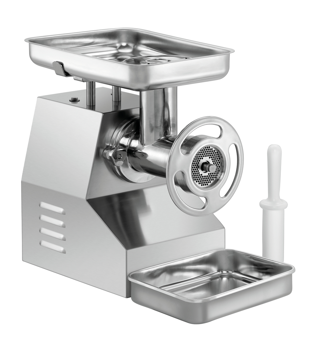 This meat grinder, featuring the Unger system, an extra-large filling chute, and a ventilated motor, can produce up to 500 kg per hour. The removable mincing unit allows for HACCP-compliant storage in the refrigerator.