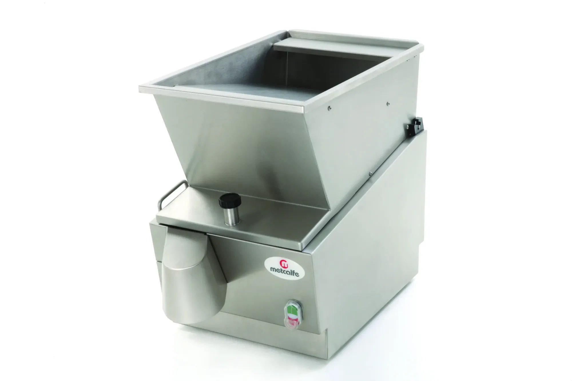 The Metcalfe EC12 Potato Chipper features a rust-proof stainless steel construction, ensuring easy maintenance, cleaning, and high standards of hygiene. The machine is designed for convenience, requiring no tools to dismantle or change blades. It is fully interlocked and safeguarded with a no-volt release feature to prevent automatic restart in the event of a power supply interruption.
