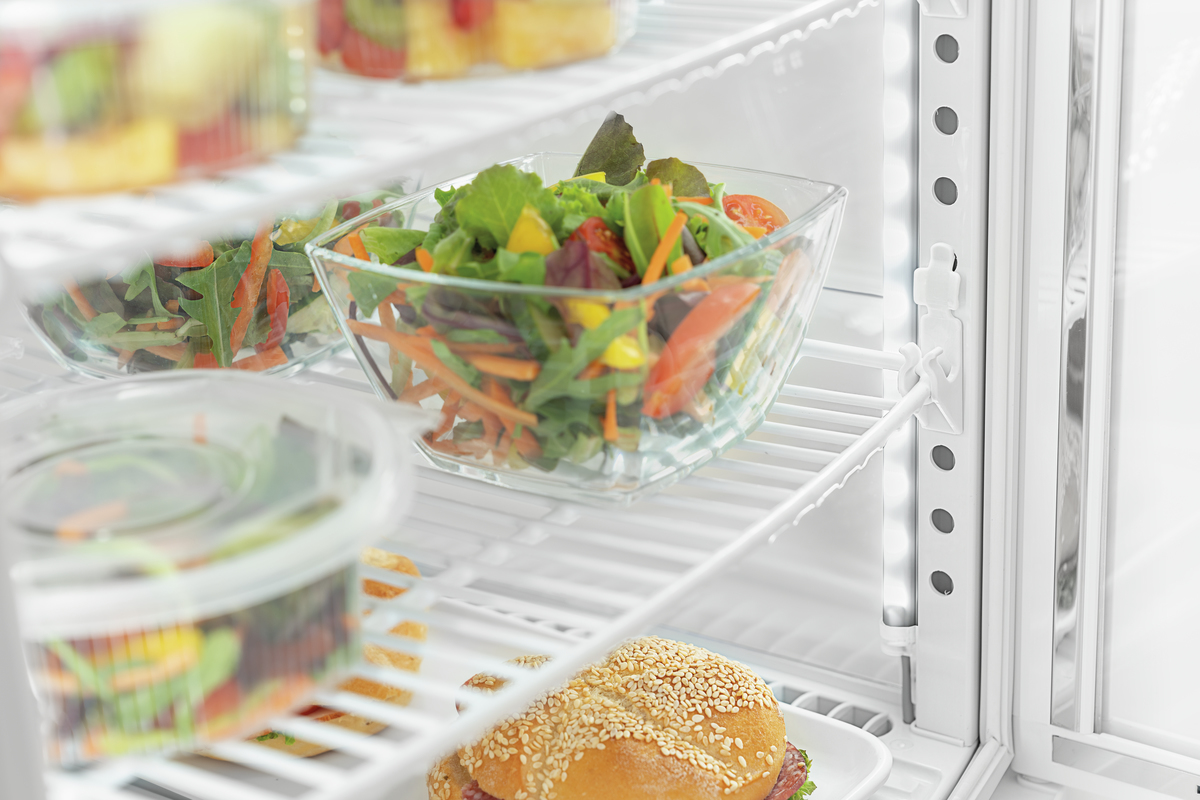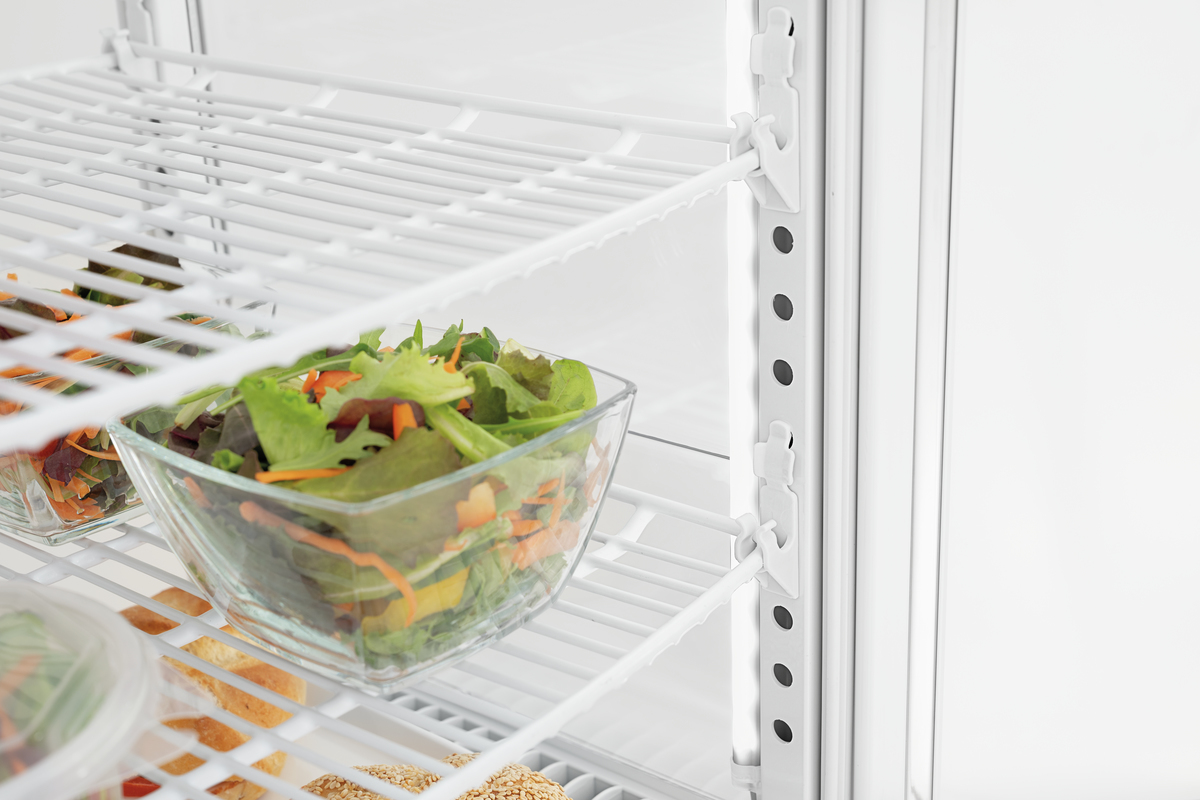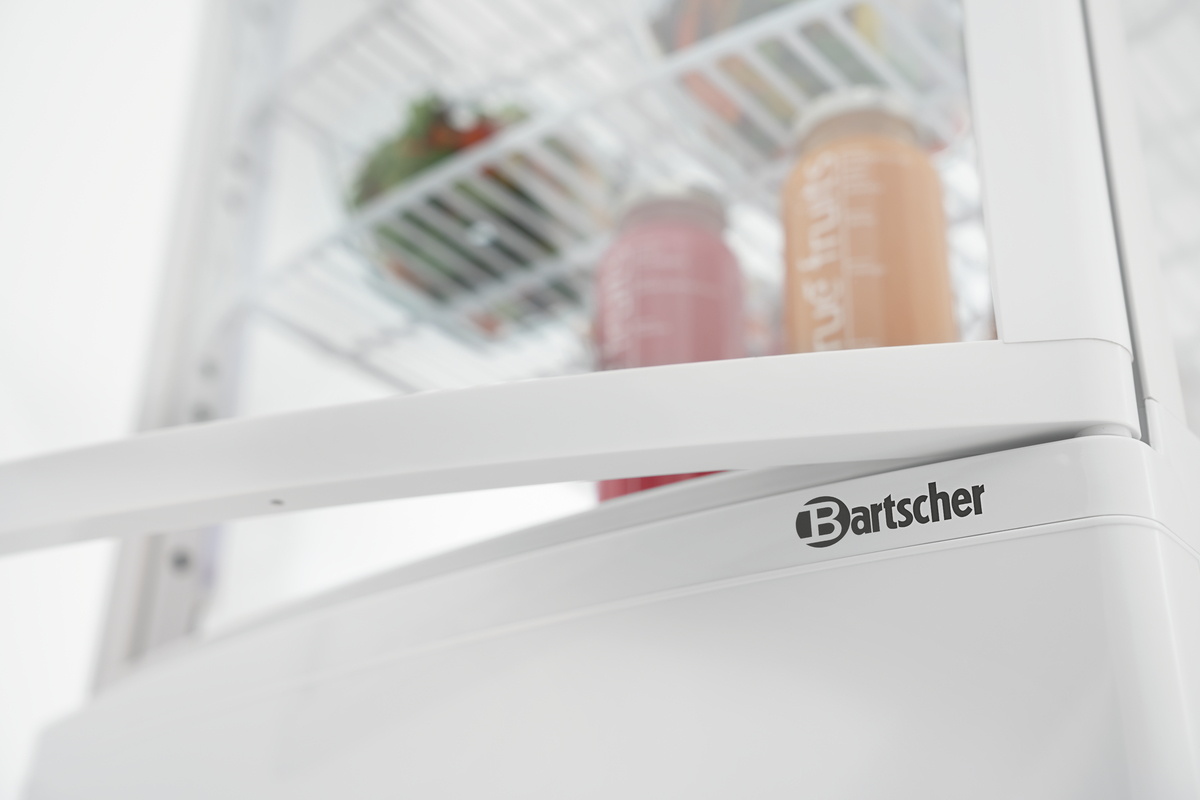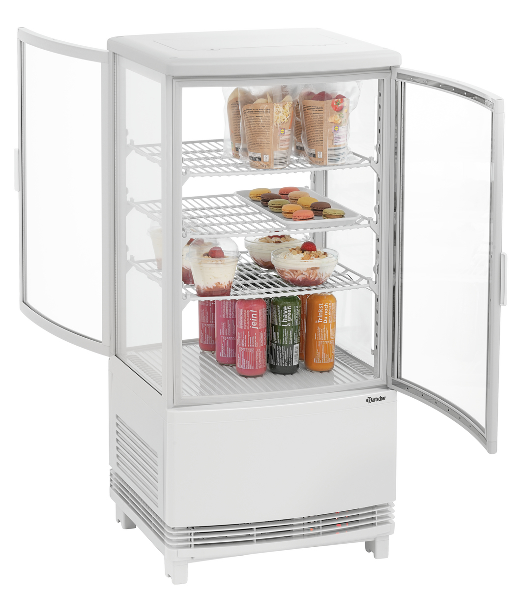 This mini cooler features convex leaf doors on both the front and back, making it ideal for use on counters. It includes height-adjustable racks, allowing the white cooler to be flexibly arranged across four levels, with a capacity of 75 litres. The LED lighting enhances the presentation of chilled goods, showcasing them in the best possible light.