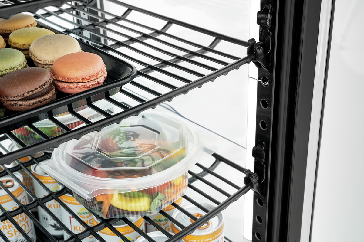 This mini cooler features convex leaf doors on both the front and back, making it ideal for use on counters. It includes height-adjustable racks, allowing the black cooler to be flexibly configured across four levels, providing space for 98 liters. The LED lighting enhances the presentation of chilled goods, showcasing them in the best possible light.