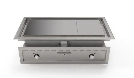 The Mirror ME90 DI - Drop In Plancha is a thermostatically controlled, heavy-duty electric chrome griddle. It is ideal for fast food operators, mobile trailers, and front-of-house cooking.