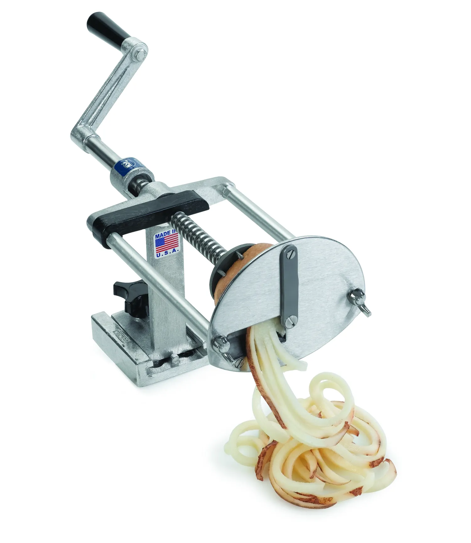 Spiral Fry allows you to transform potatoes into plates full of uniquely appetizing, fresh, thin spiral fries that can generate significant profits for you. Simply load a potato of up to 70-count and turn the easy-action drive screw. No peeling is required. The device easily releases and retracts for fast reloading, and the preset drive depth protects blades from contact with metal parts. Its heavy-duty construction ensures durability and a long lifespan. The Spiral Fry mounts securely on any flat surface for both left- or right-handed operation and can be removed easily for quick cleanup—just loosen the mounting nut, slide out, and rinse.